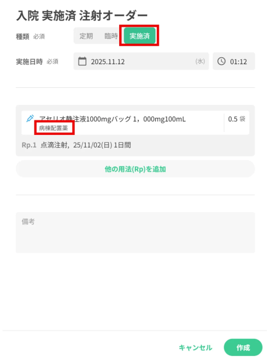 注射オーダーを作成する際、注射の種類を[実施済]にします