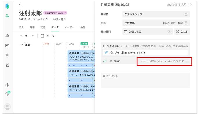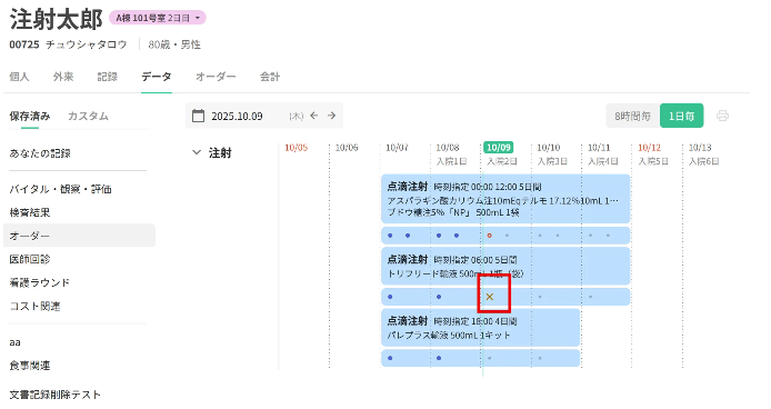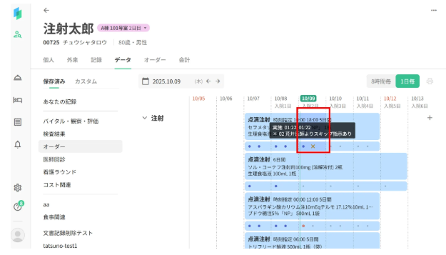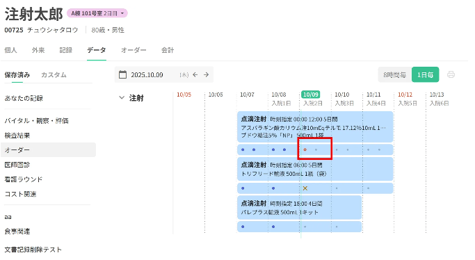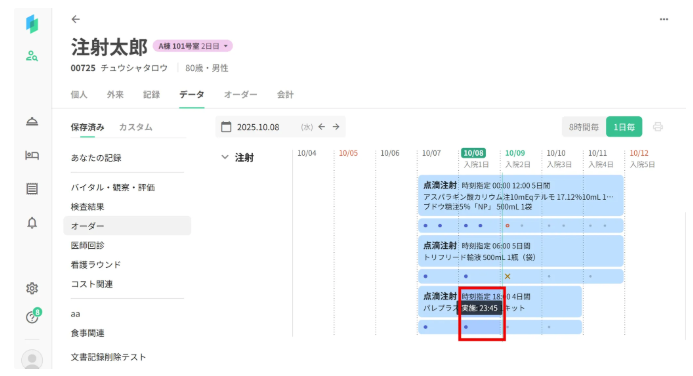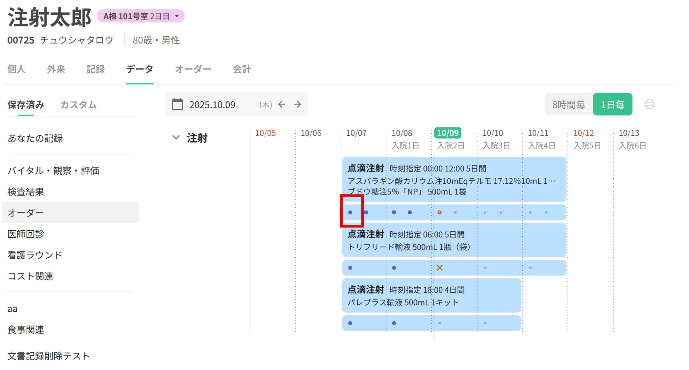 投与実績を確認したい注射オーダーをクリックし実施記録画面をひらきます