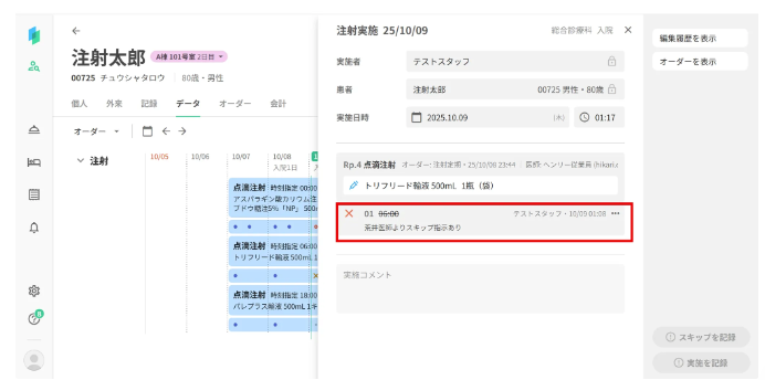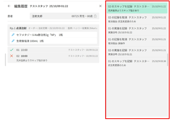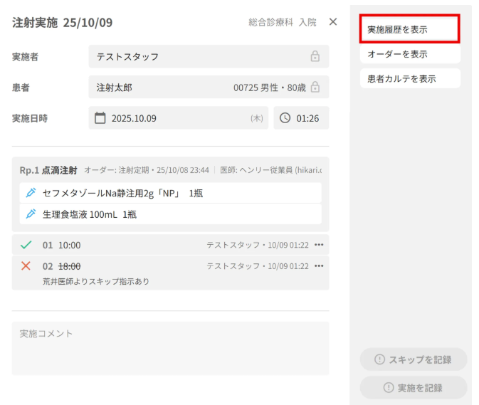 実施済の履歴、実施済の取り消し履歴、スキップの履歴が確認でき、それぞれの実施者および実施時間、理由およびコメントを確認できます