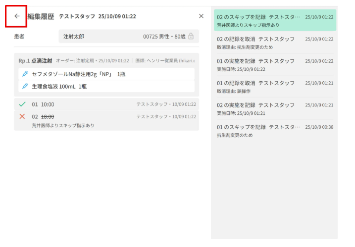 編集履歴の左横にある[←]をクリックすることで実施記録画面に戻ります