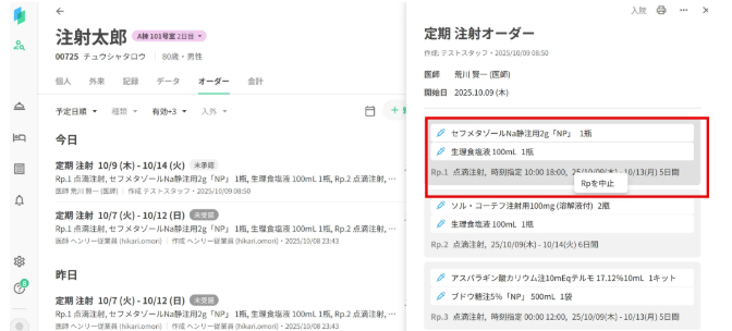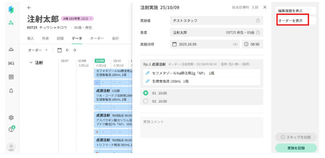 データタブにて注射オーダーを表示します