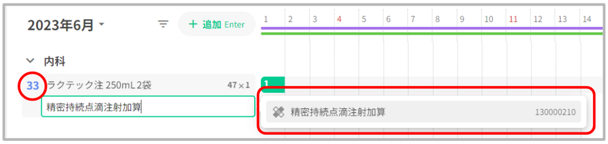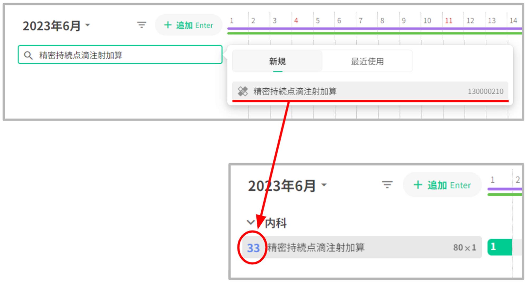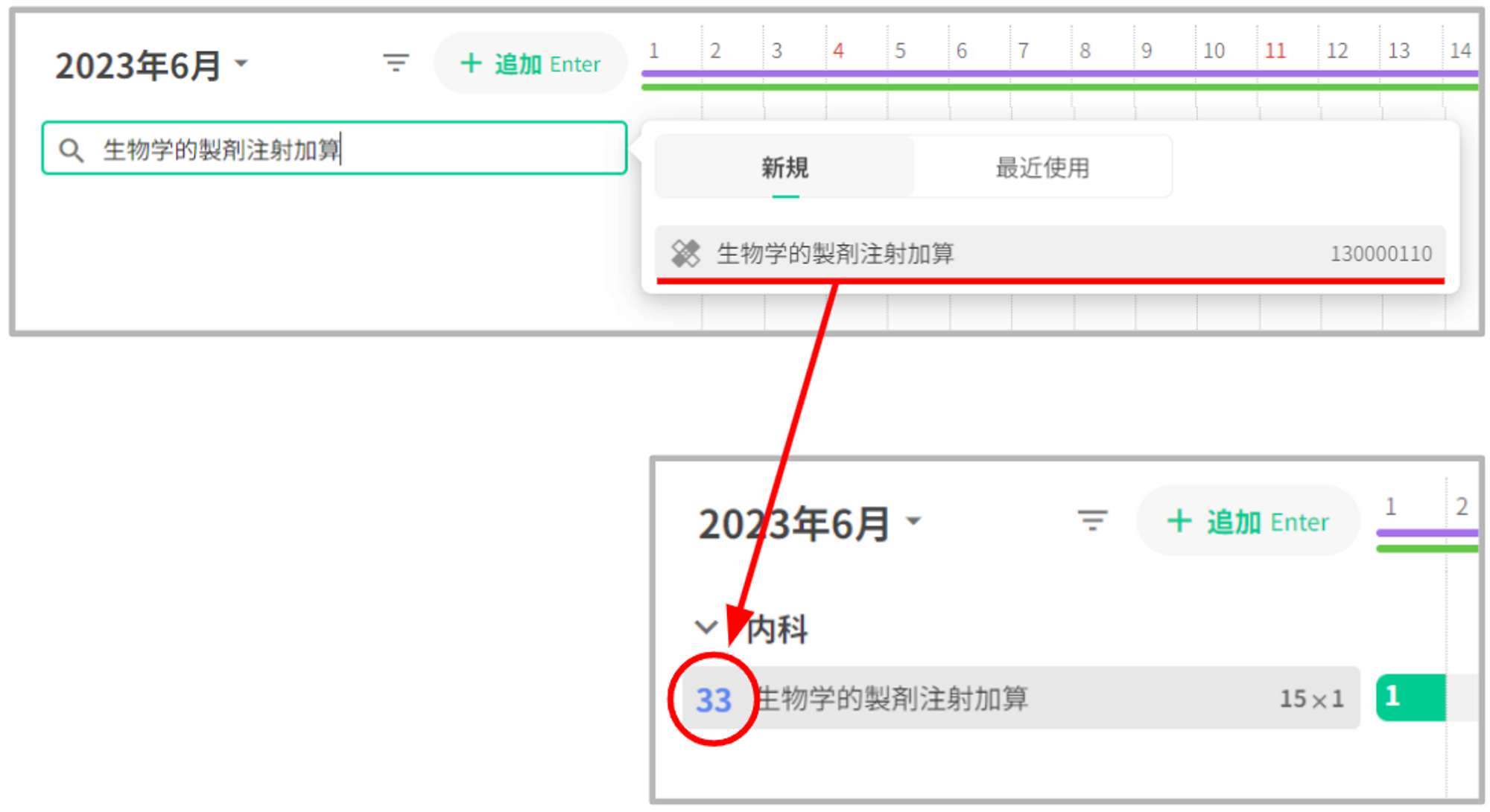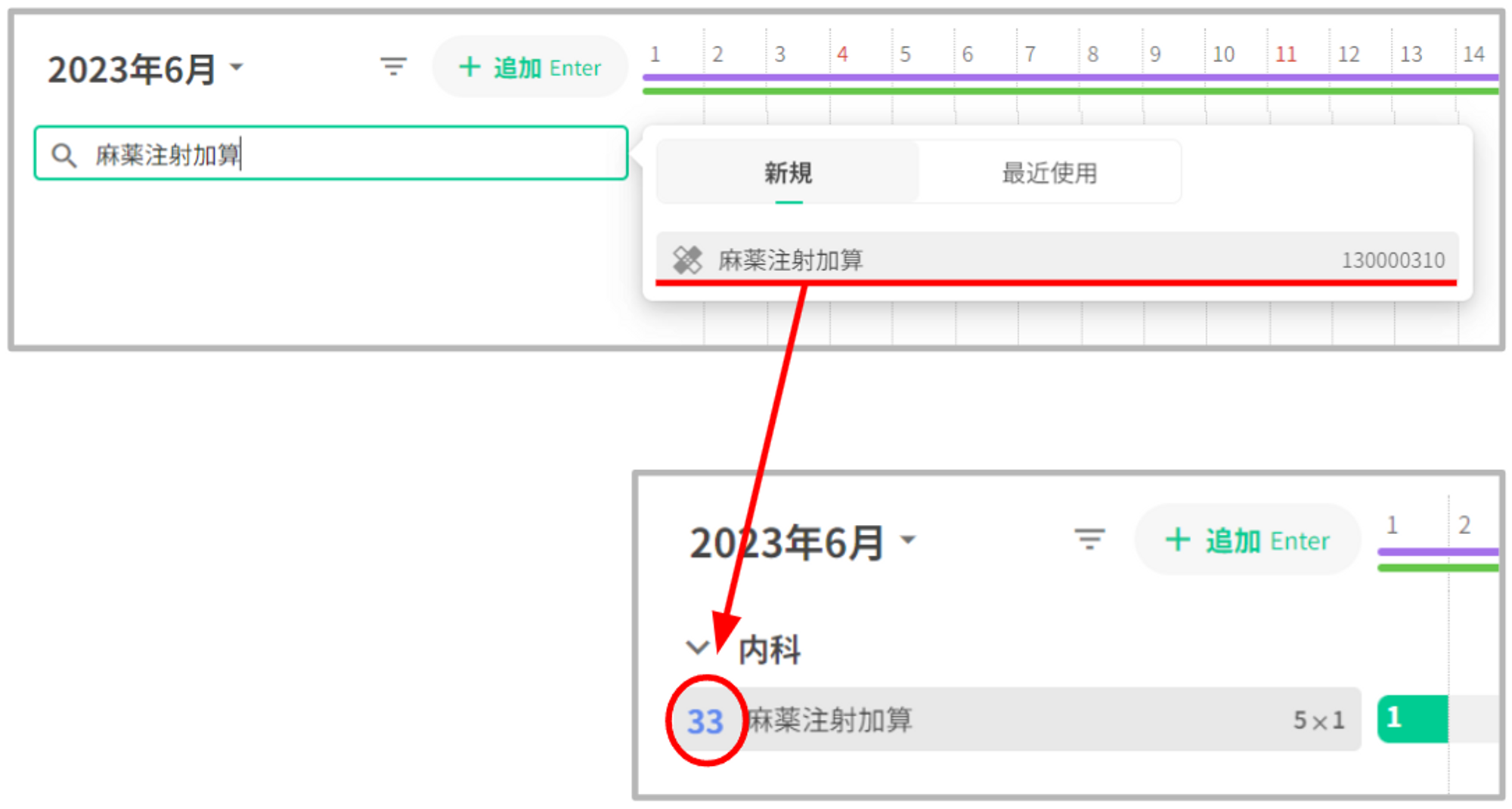 +追加」ボタンより上記注射加算を検索し追加すると、診療識別が「33 注射(その他)」の状態で追加されるようになっています。