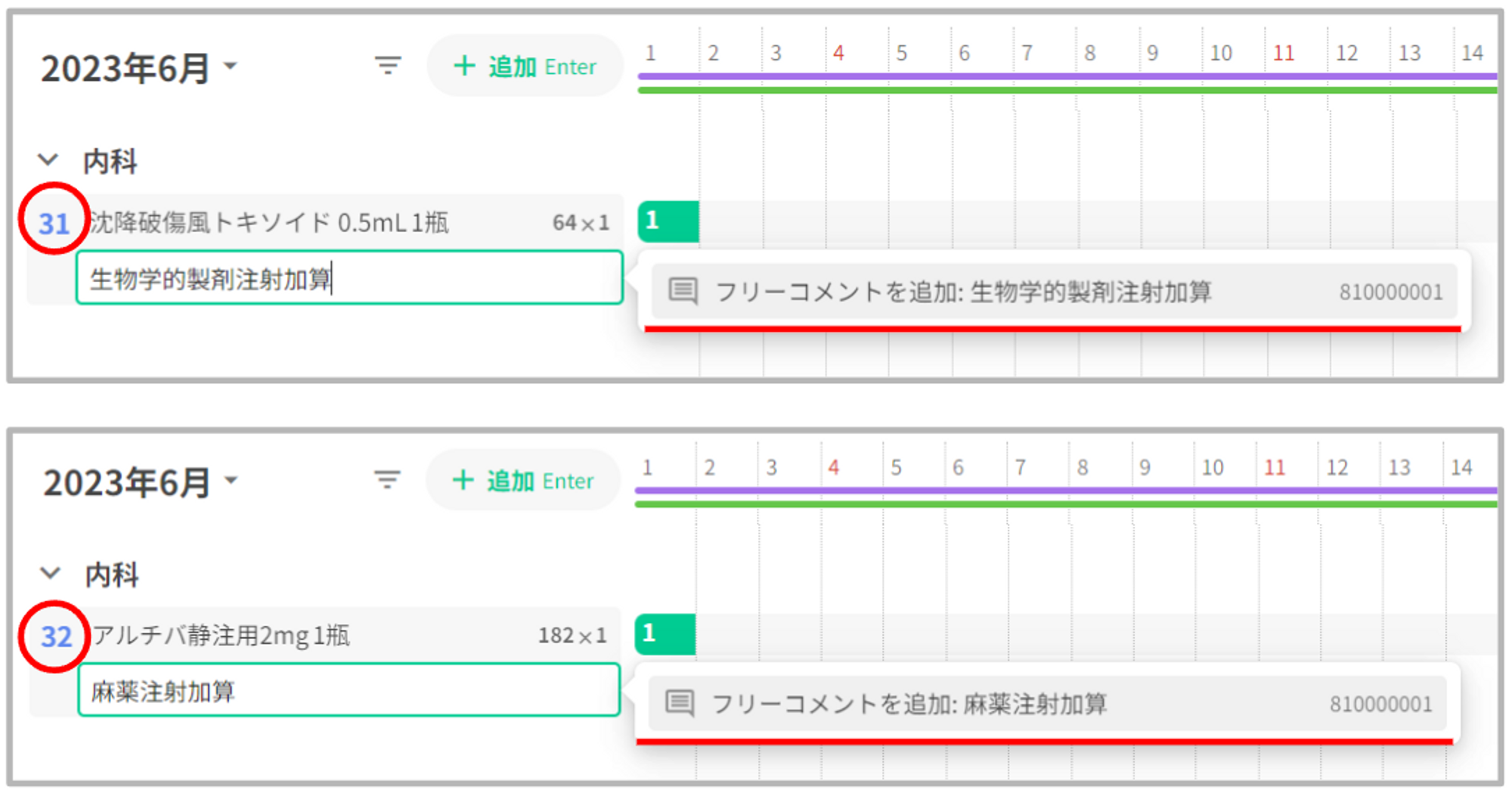 「31 注射(皮下筋肉内)」や「32 注射(静脈内)」の算定単位に紐づく項目として検索しても検索結果に表示されず追加することはできませんのでご留意ください。