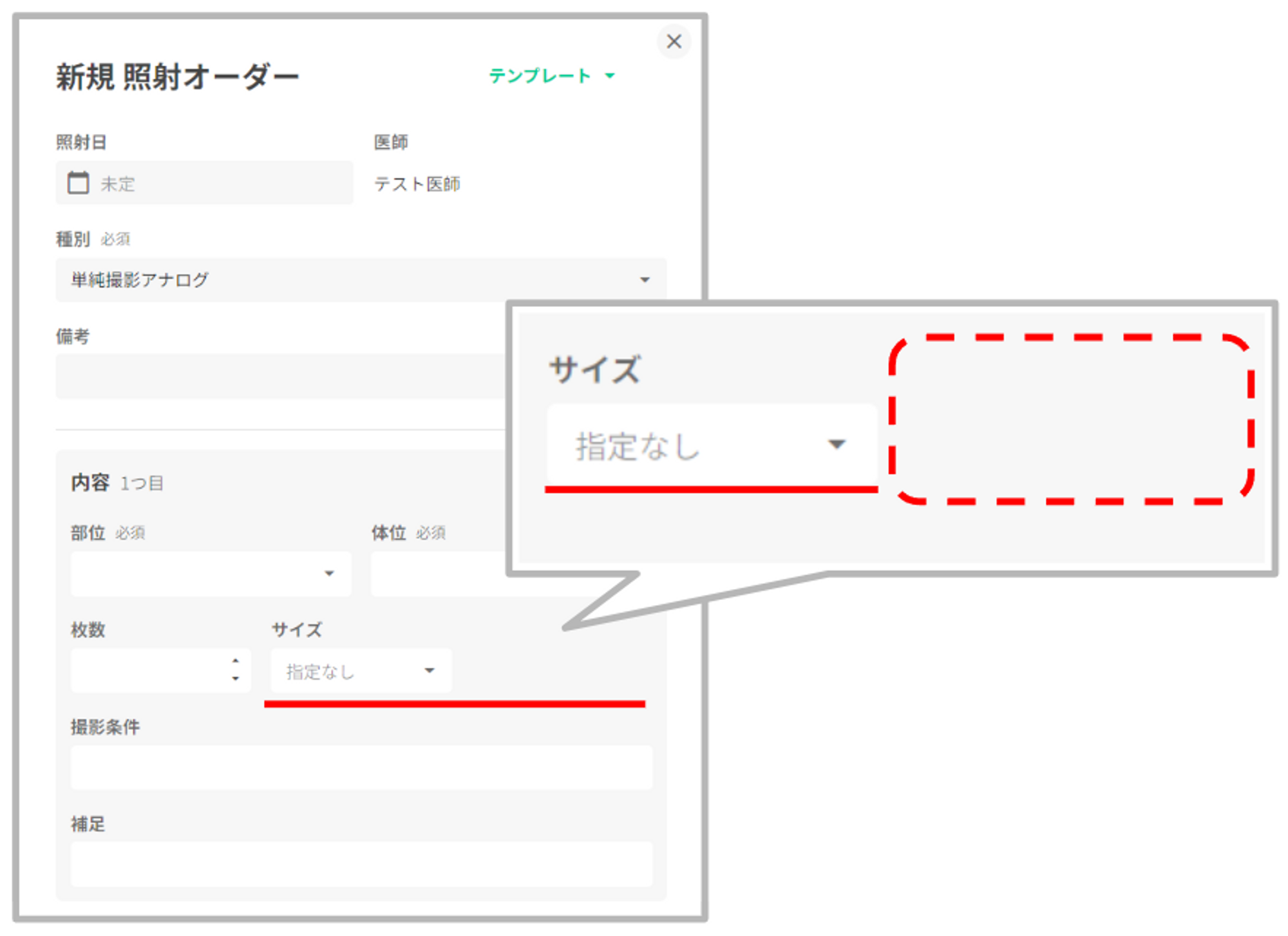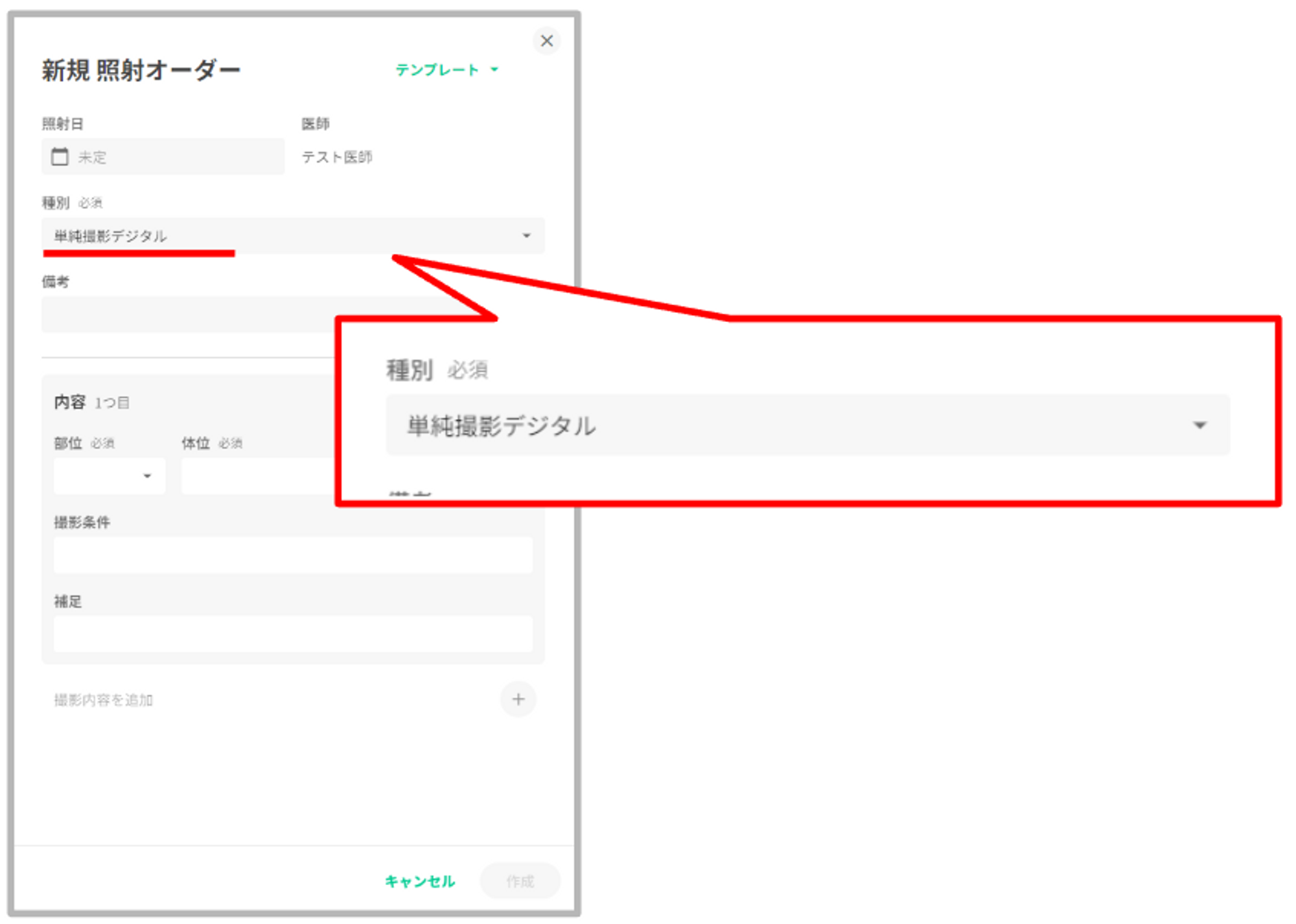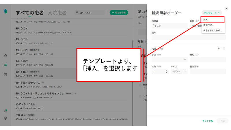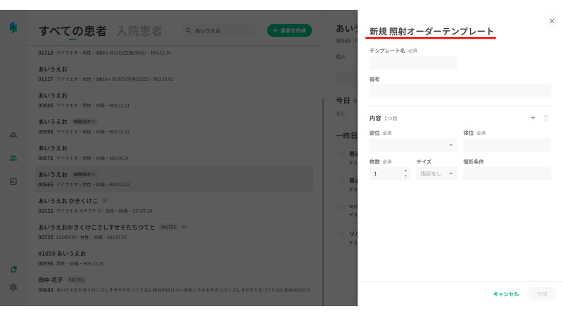 撮影種別に対応した入力項目でテンプレート作成できます。 ①「依頼」タブの「+依頼」を押下し、照射オーダーを選択します。