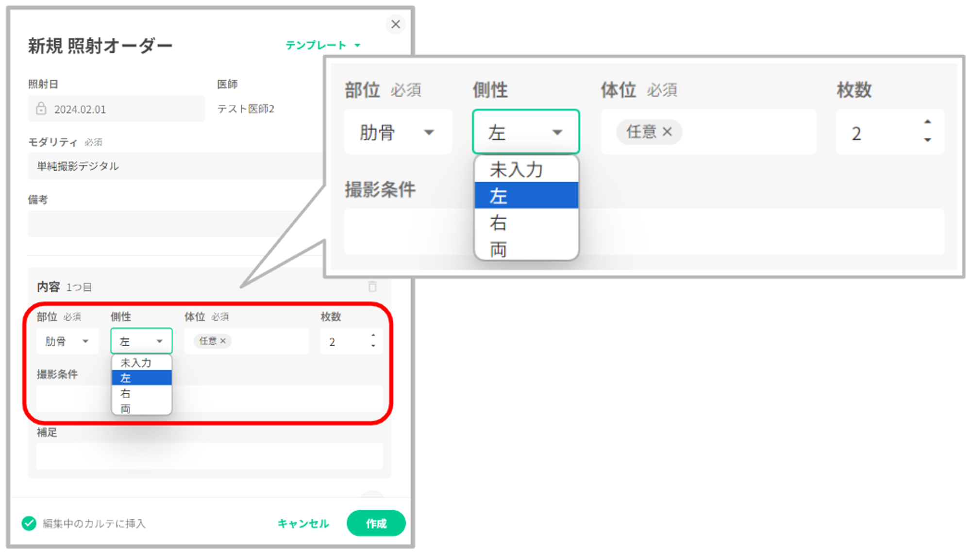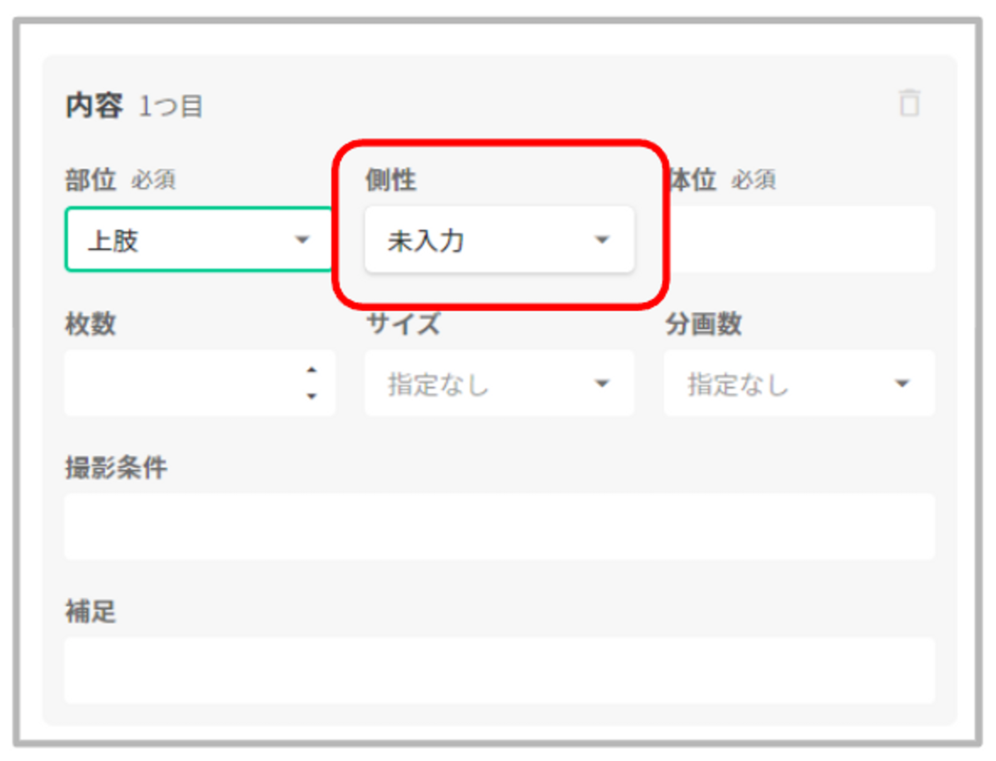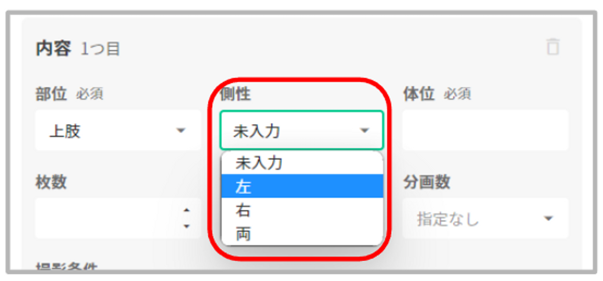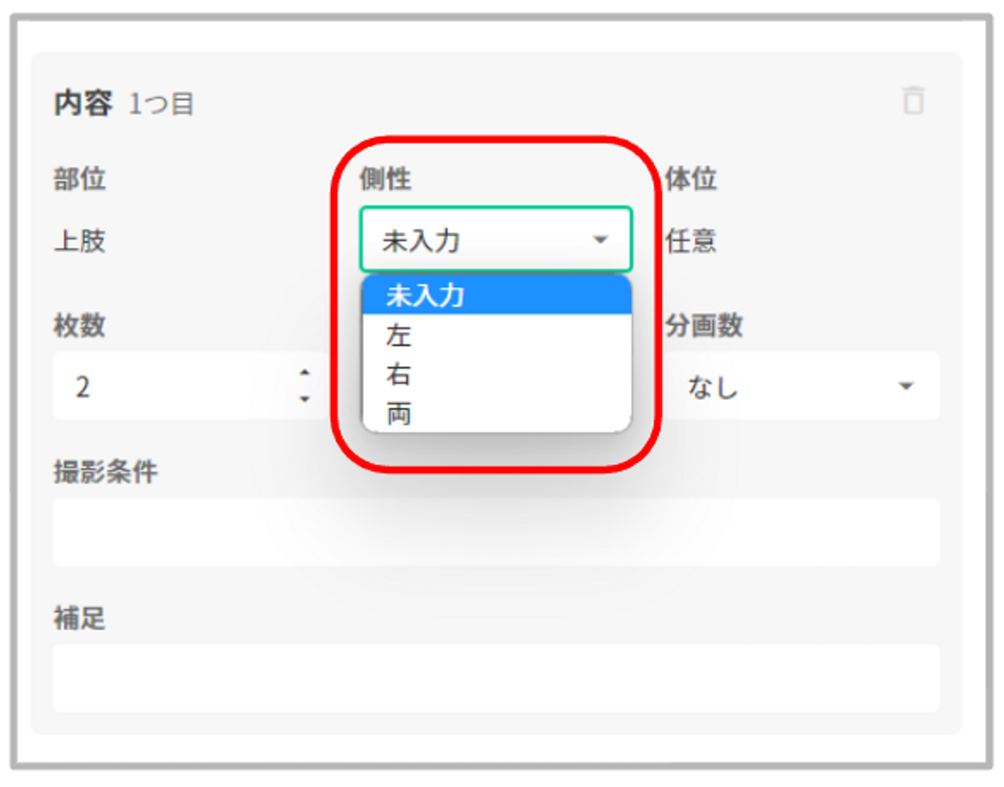 「部位」で「側性」を持つ項目を選択した場合、「側性」の選択肢が表示されます。