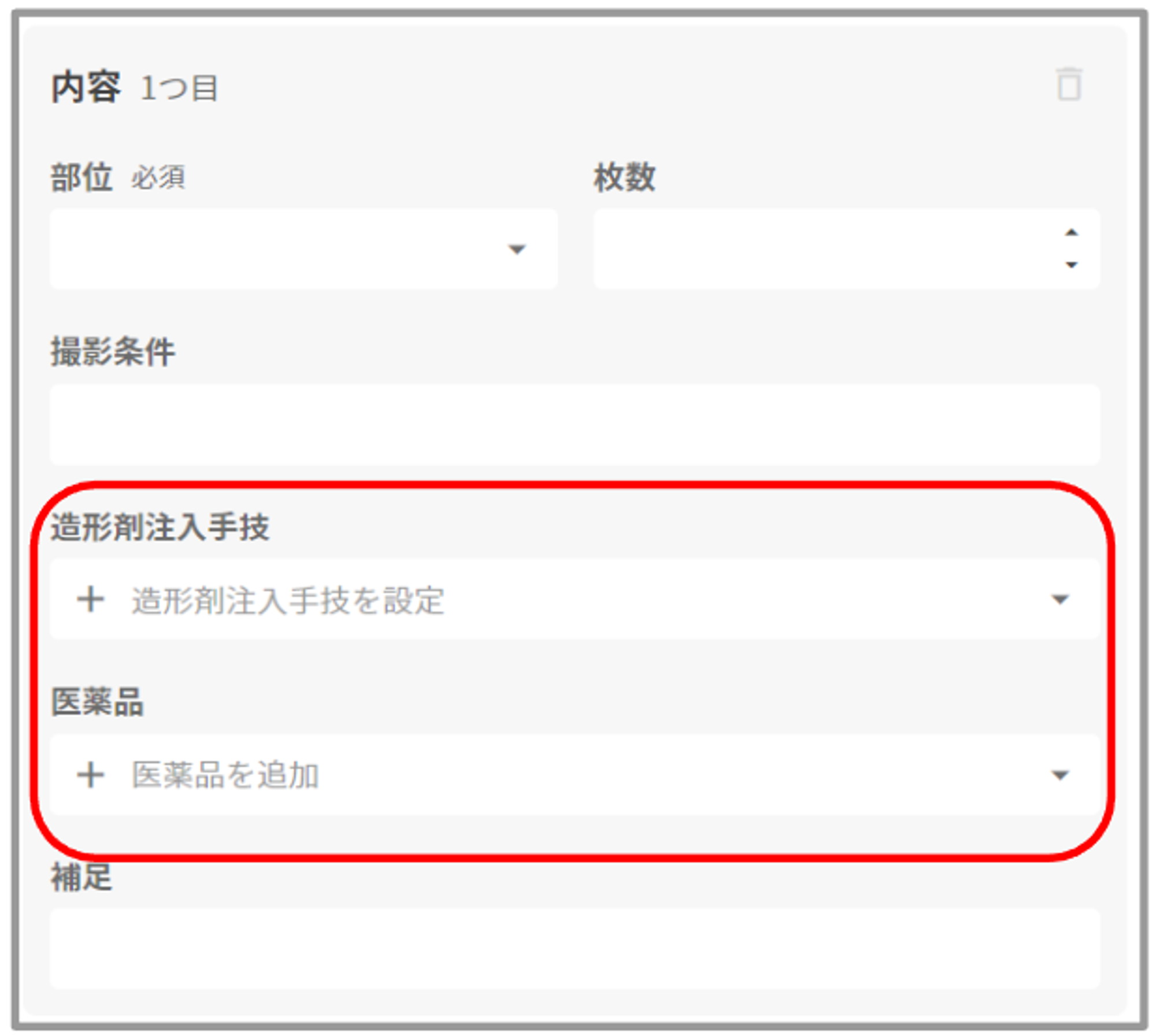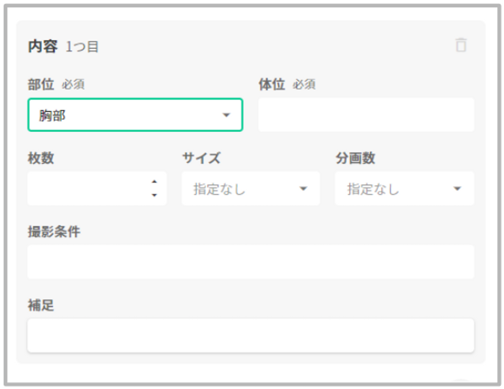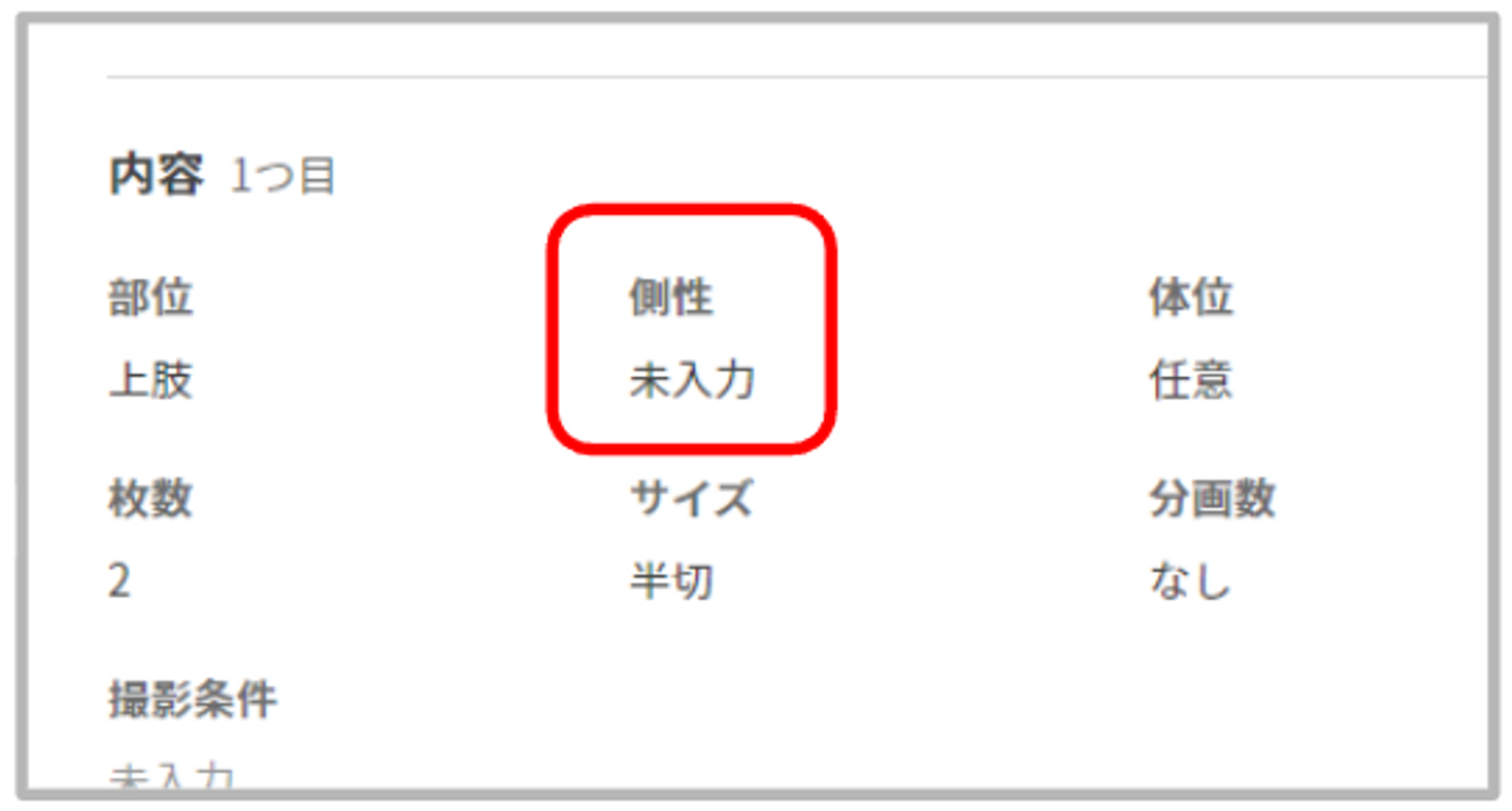 「側性」を持たない「部位」を選択した場合は、「側性」の入力欄は表示されません。