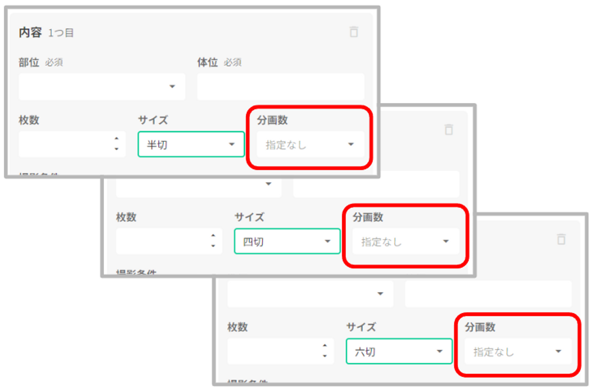 【アナログ撮影を選択】 「サイズ」「分画数(半切・大角・大四ツ切・四ツ切・六ツ切選択の場合)」の入力が可能です。