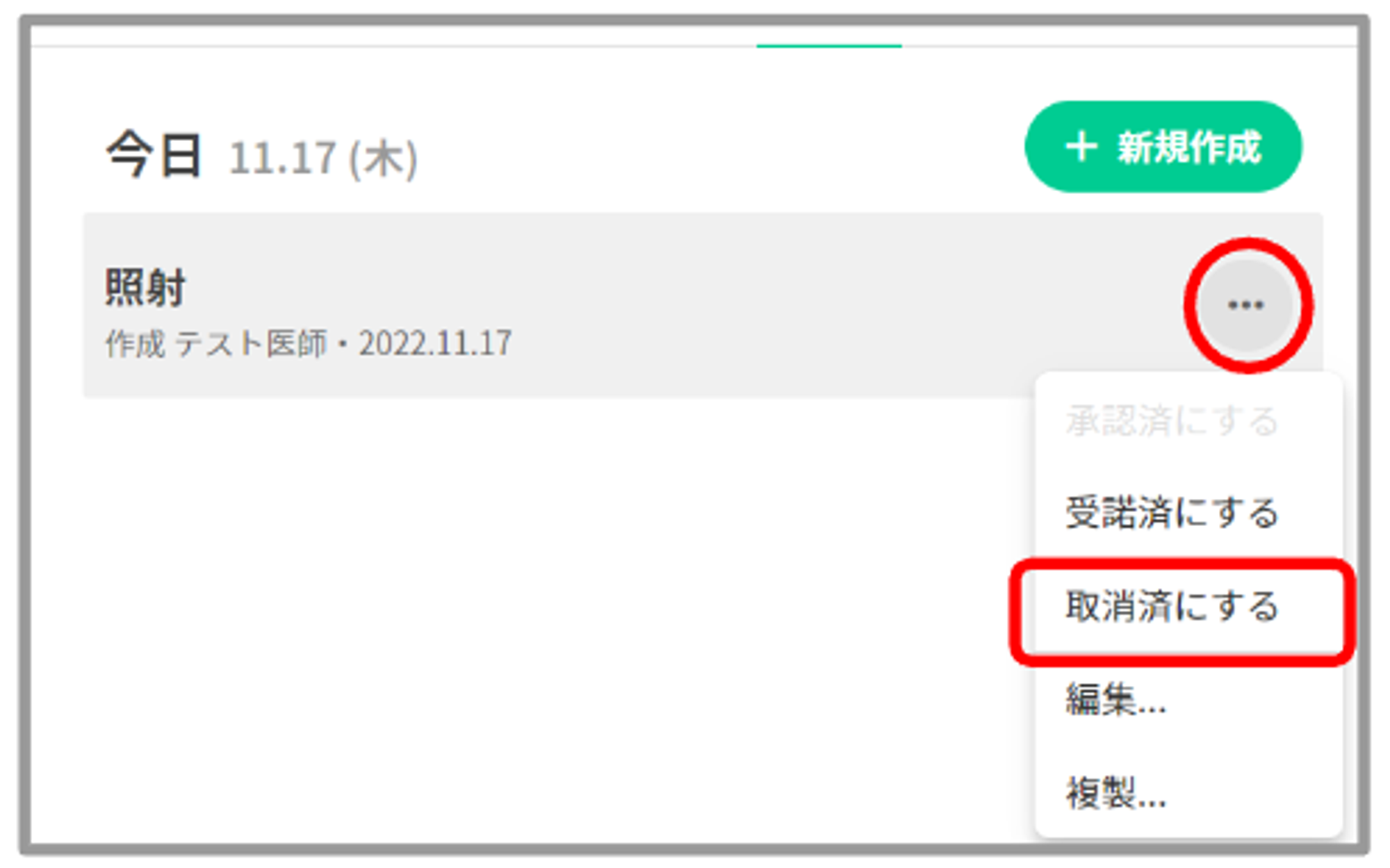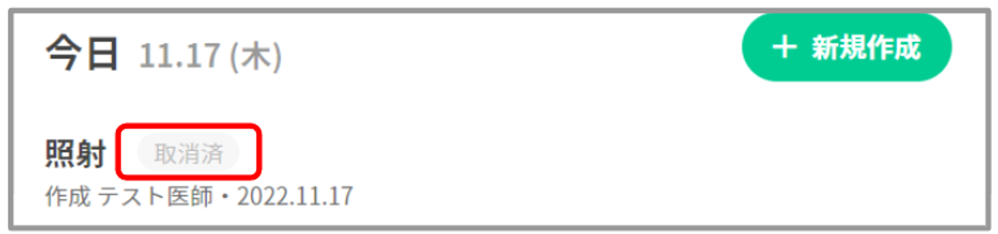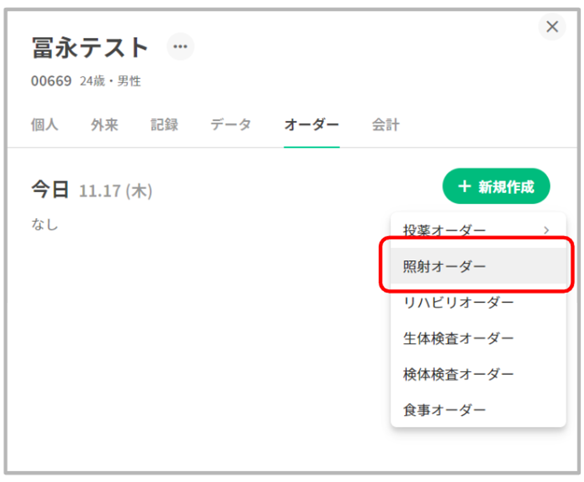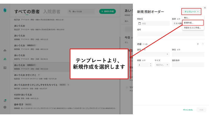 ①オーダータブの「+新規作成」を押下し、オーダーメニューより照射オーダーを選択します。