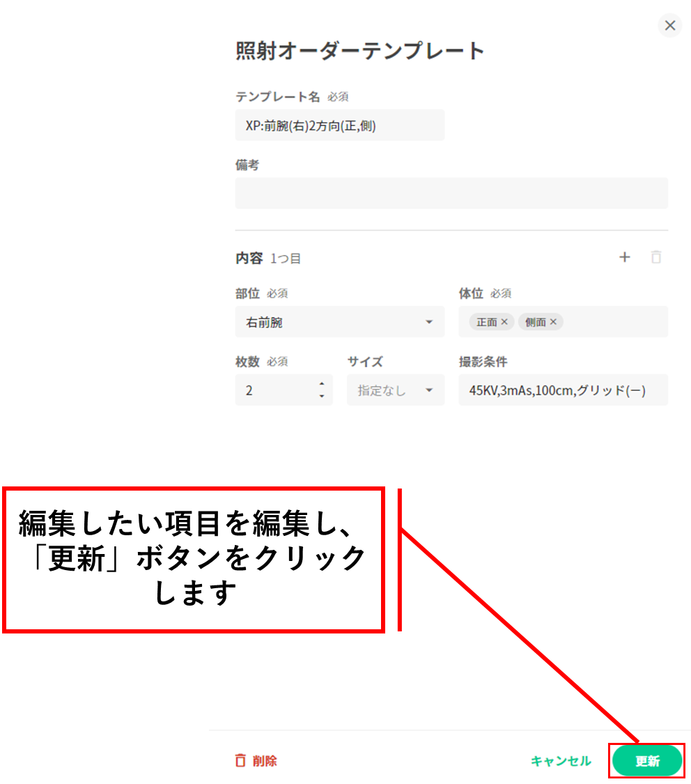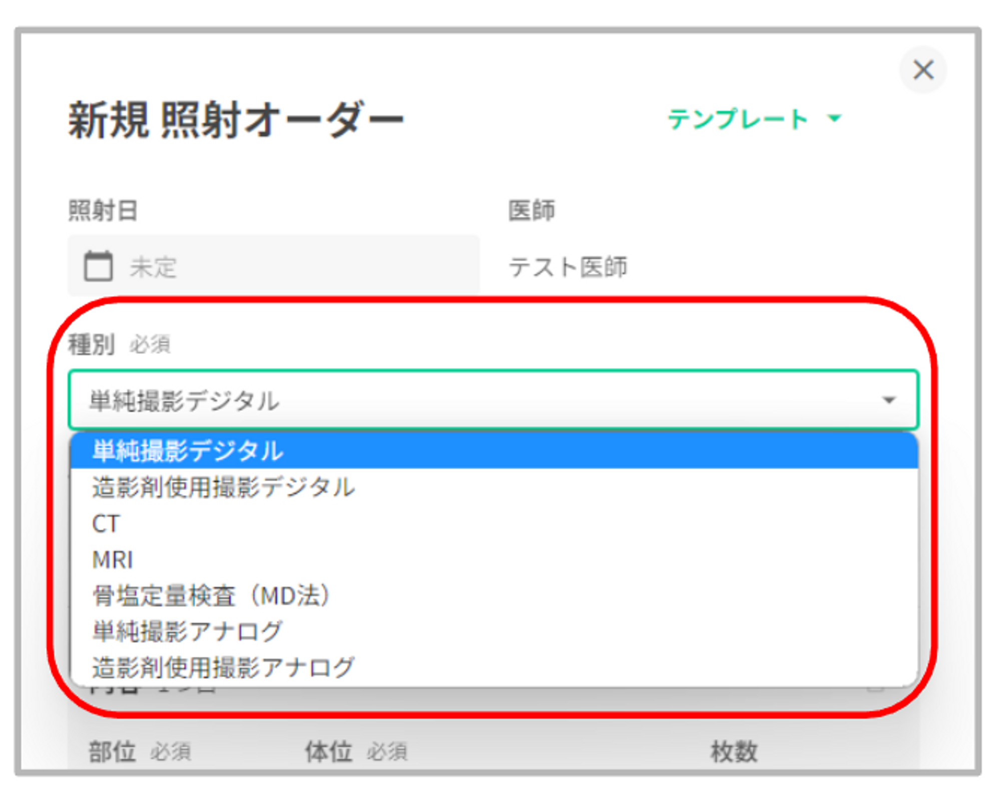 ※作成した照射オーダーの「医師・種別・部位・体位」欄は編集不可となっています。