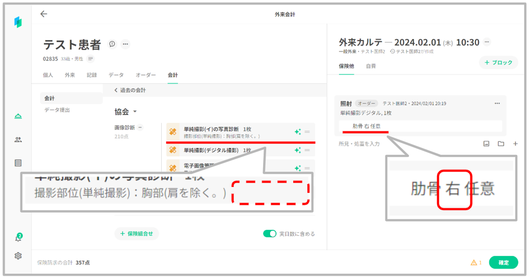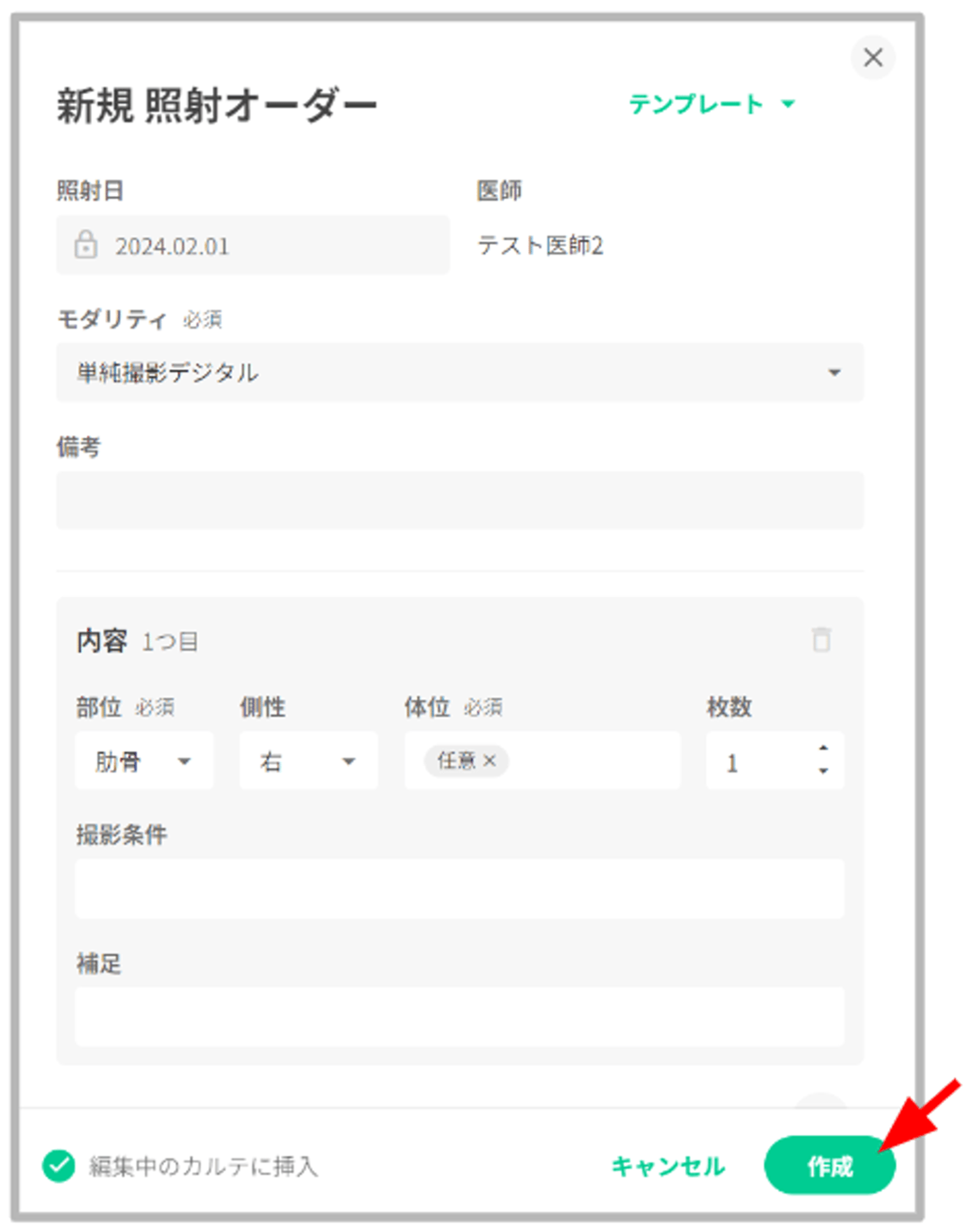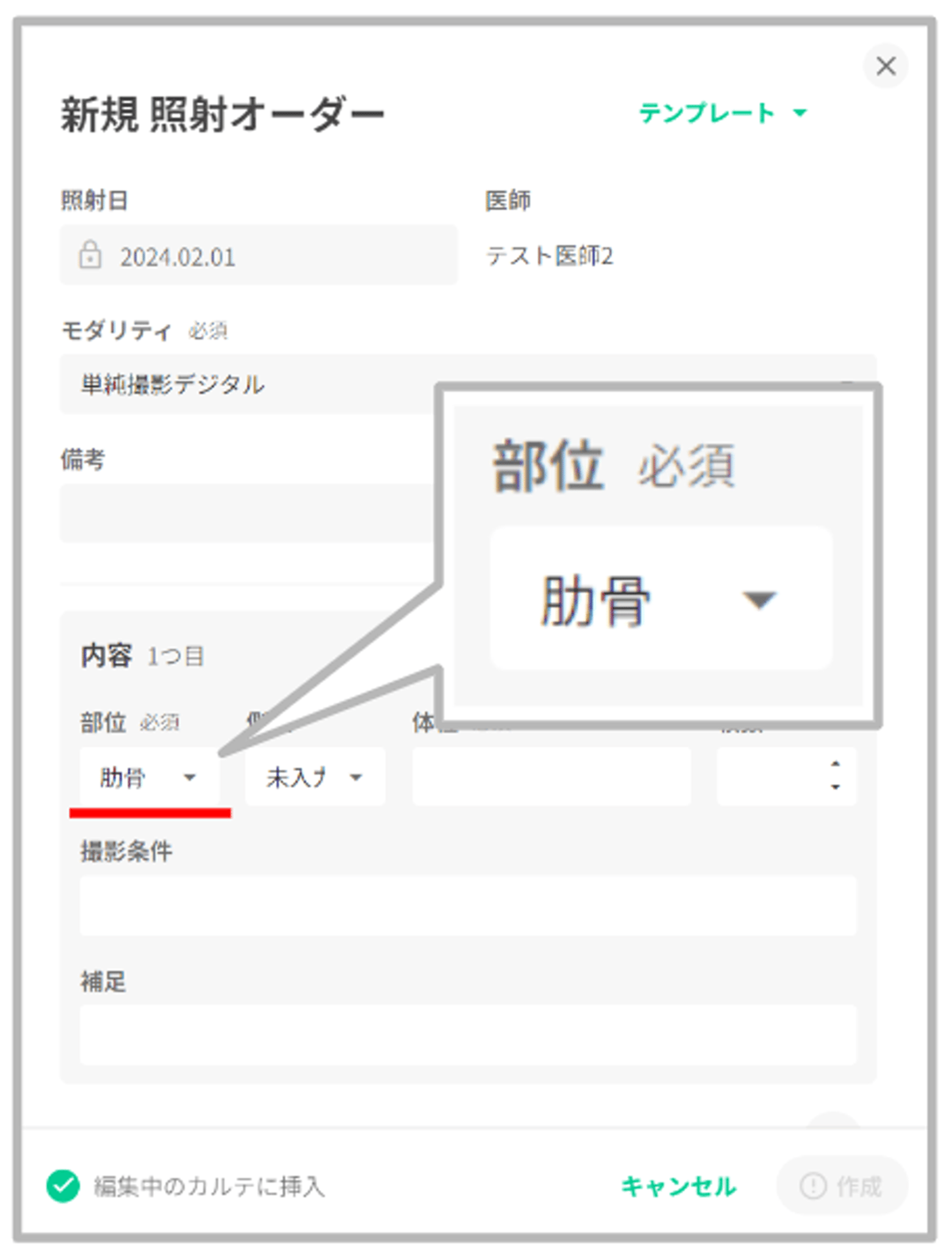 オーダー作成時に撮影部位で「肋骨」を選択する