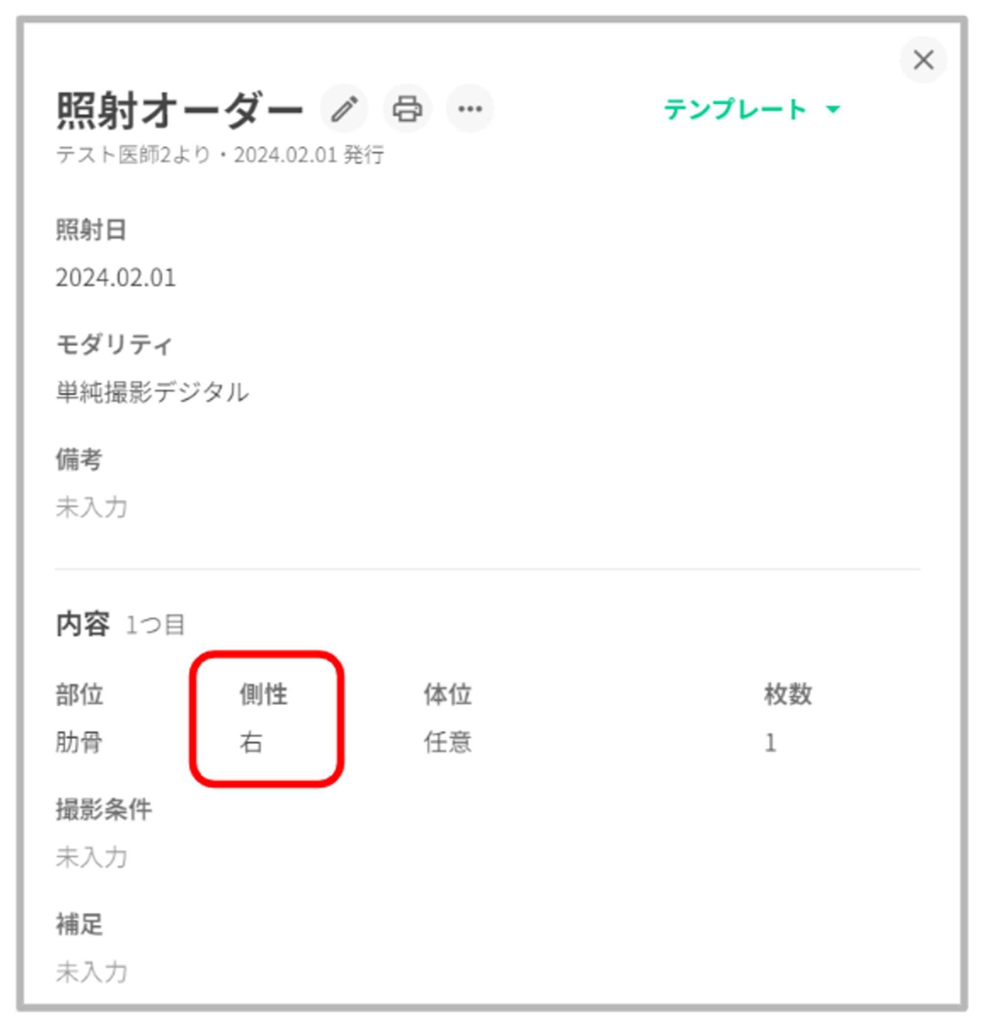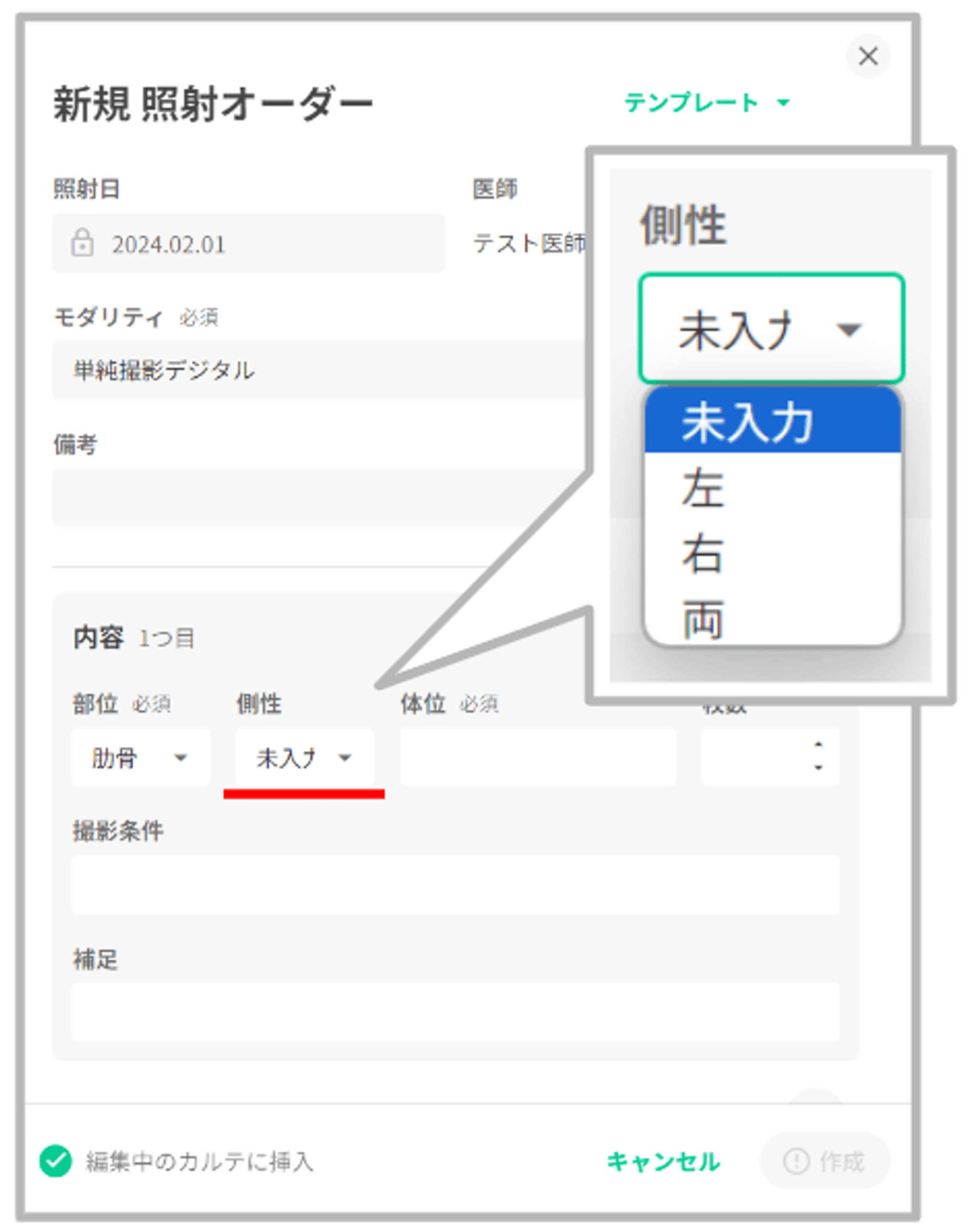 「側性」は任意項目となっており、未選択でもオーダーの作成が可能です。