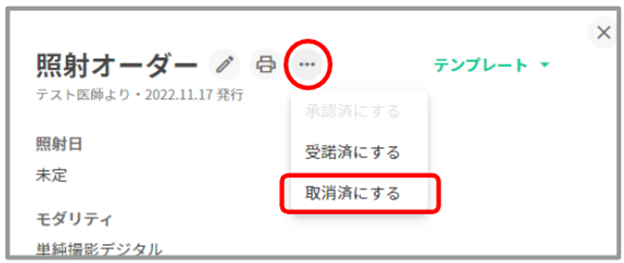 ①オーダー画面上部の「…」または、オーダー一覧右側の「…」を押下してください。 ②メニューに「取消済みにする」が表示されますので、選択してください。