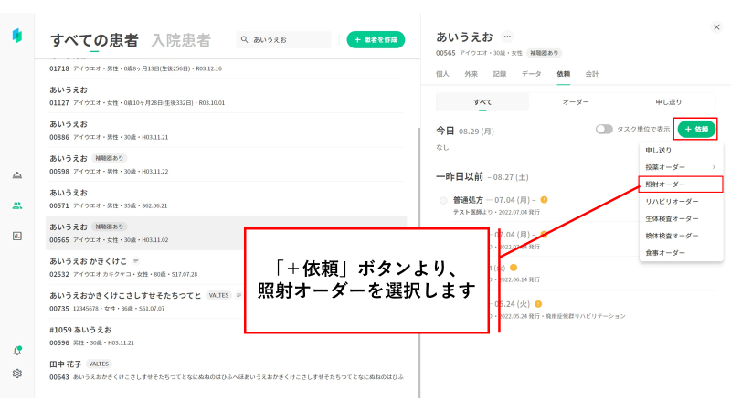 ①「+依頼」から照射オーダーを選択します・