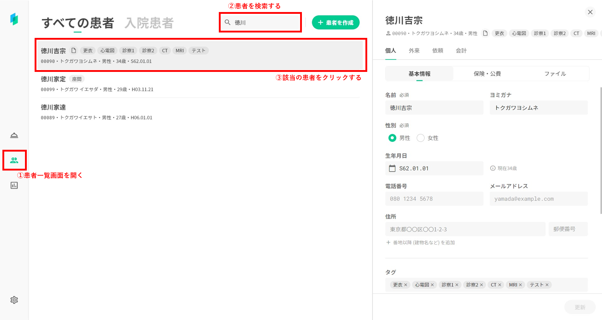 ③「外来」タブを押下すると、診療歴が表示され、これまでのカルテを閲覧することができます。