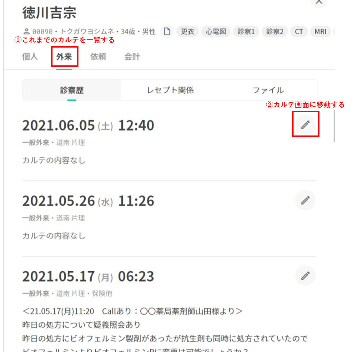 ④カルテ右端の鉛筆アイコンを押下すると、カルテ画面に遷移します。 ※診療歴以外にも、レセプト関係、ファイルから傷病名なども参照できます。