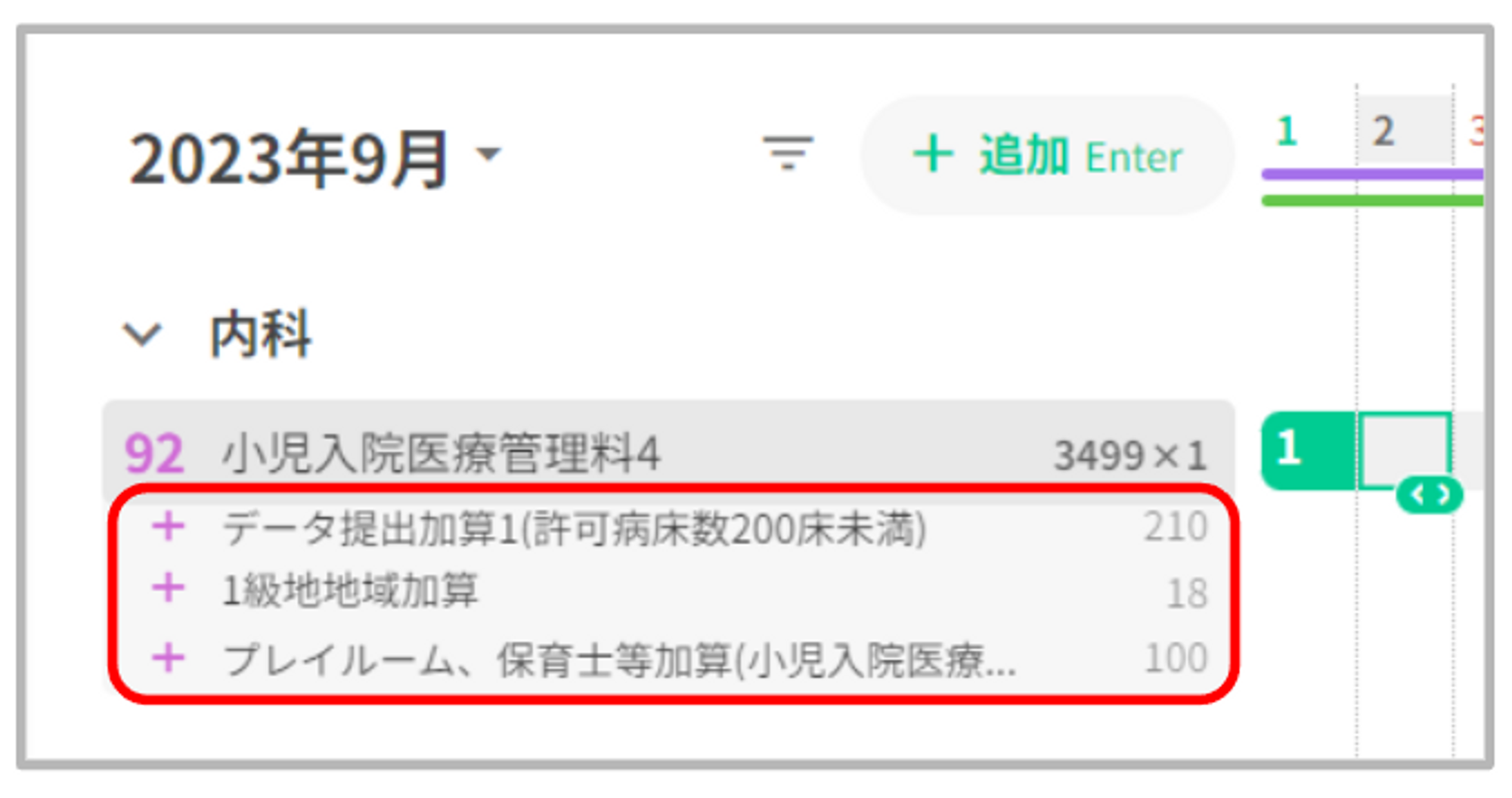 ヘンリーでは、入院基本料や特定入院料の自動算定とともに入院料加算も自動算定されるようになっております。