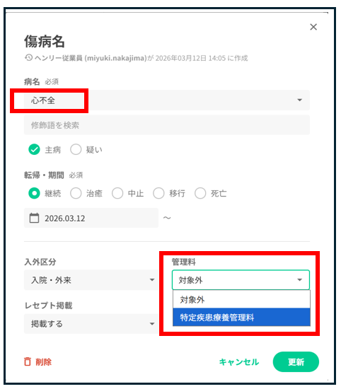 対象の傷病名を登録します