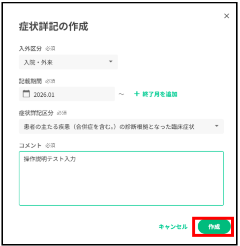 入力項目が1つでも空欄の場合、症状詳記は登録できません