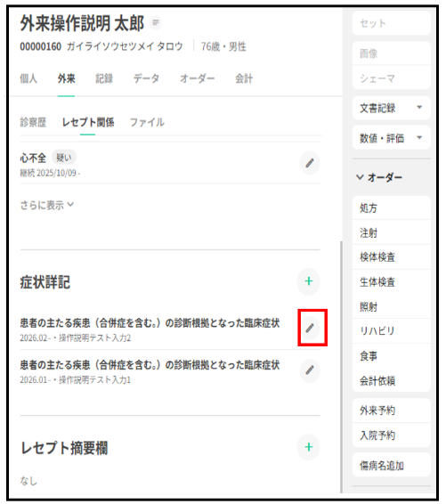 一覧に表示されている症状詳記の鉛筆マークを押下します