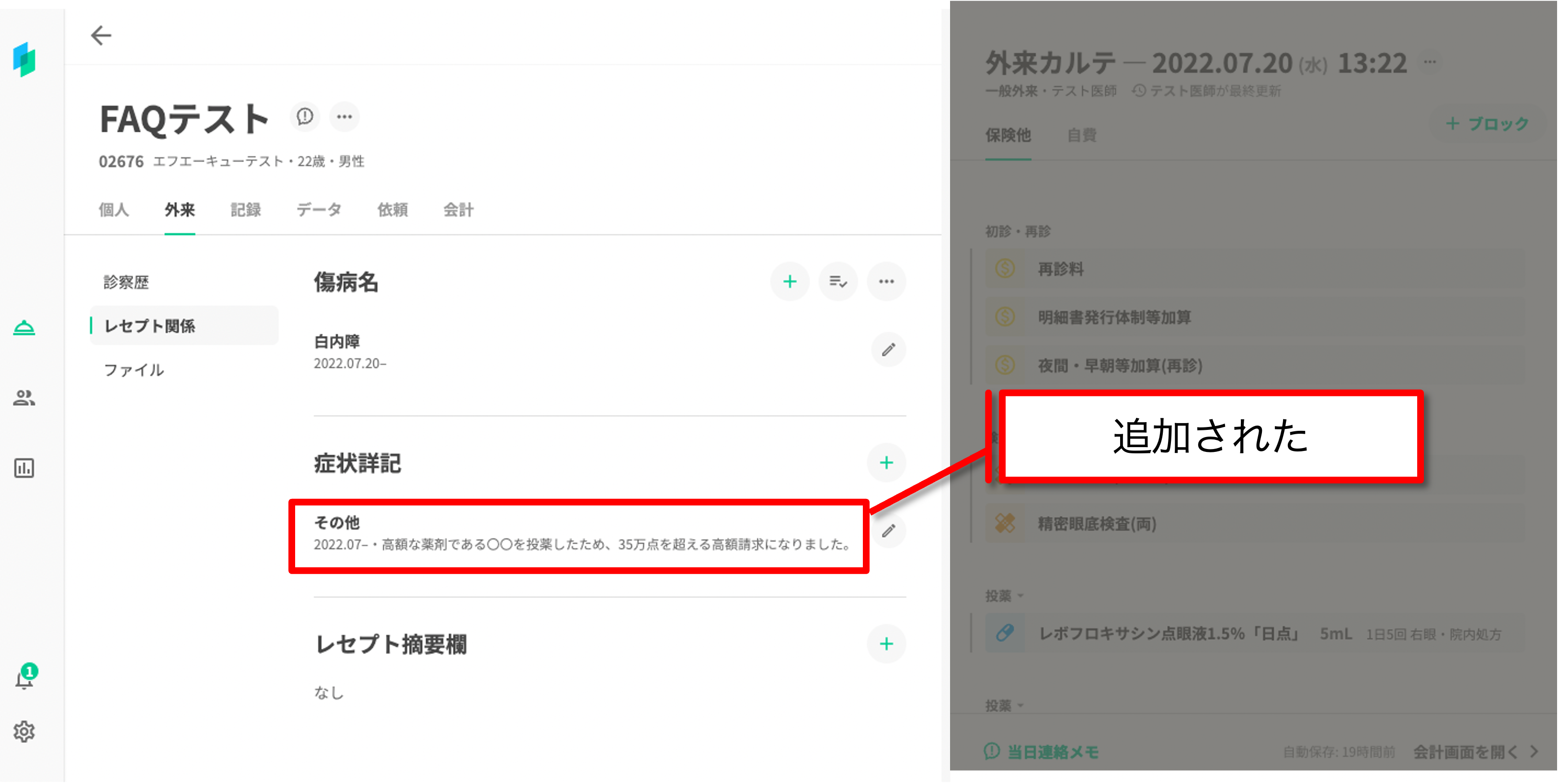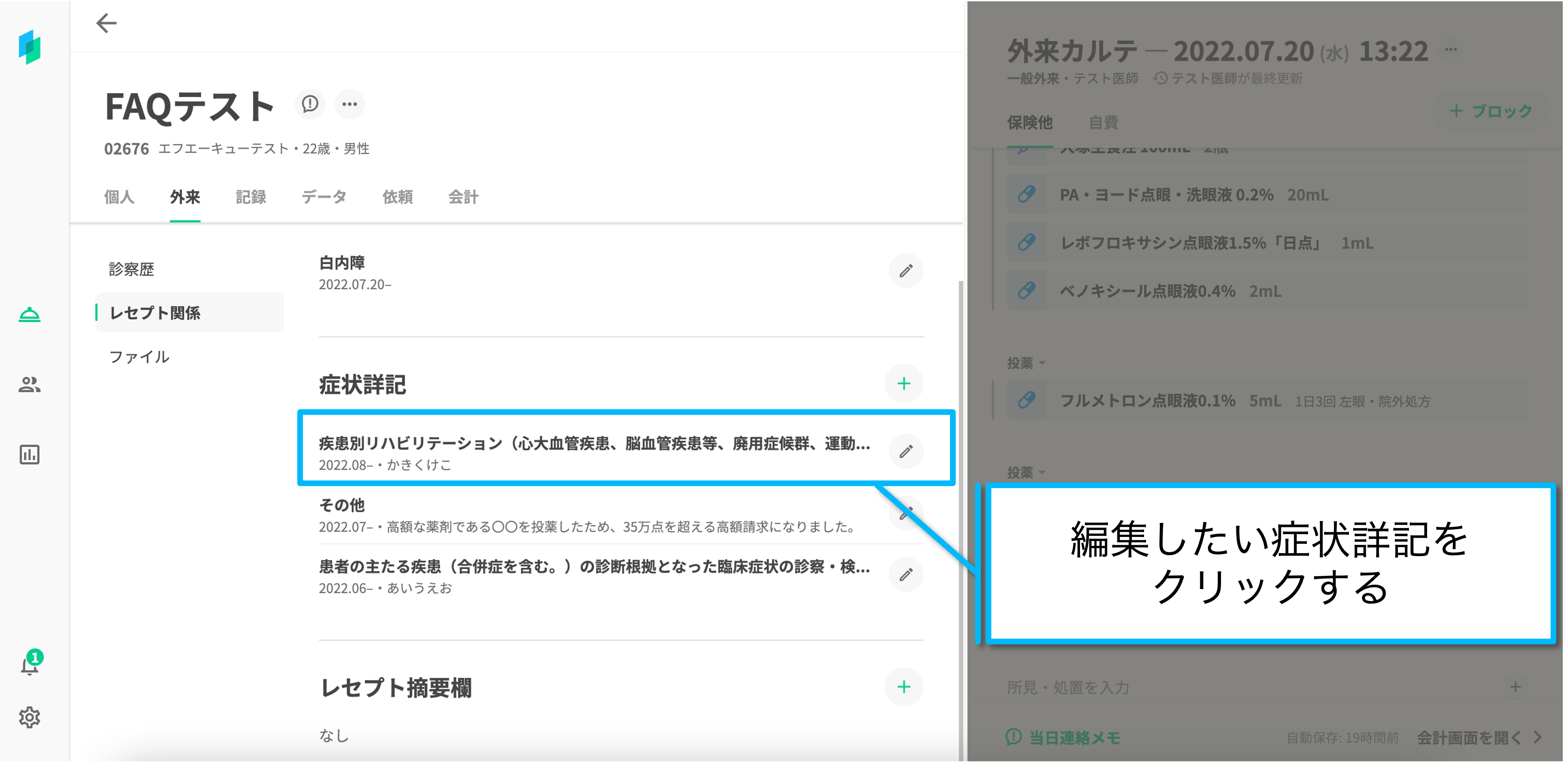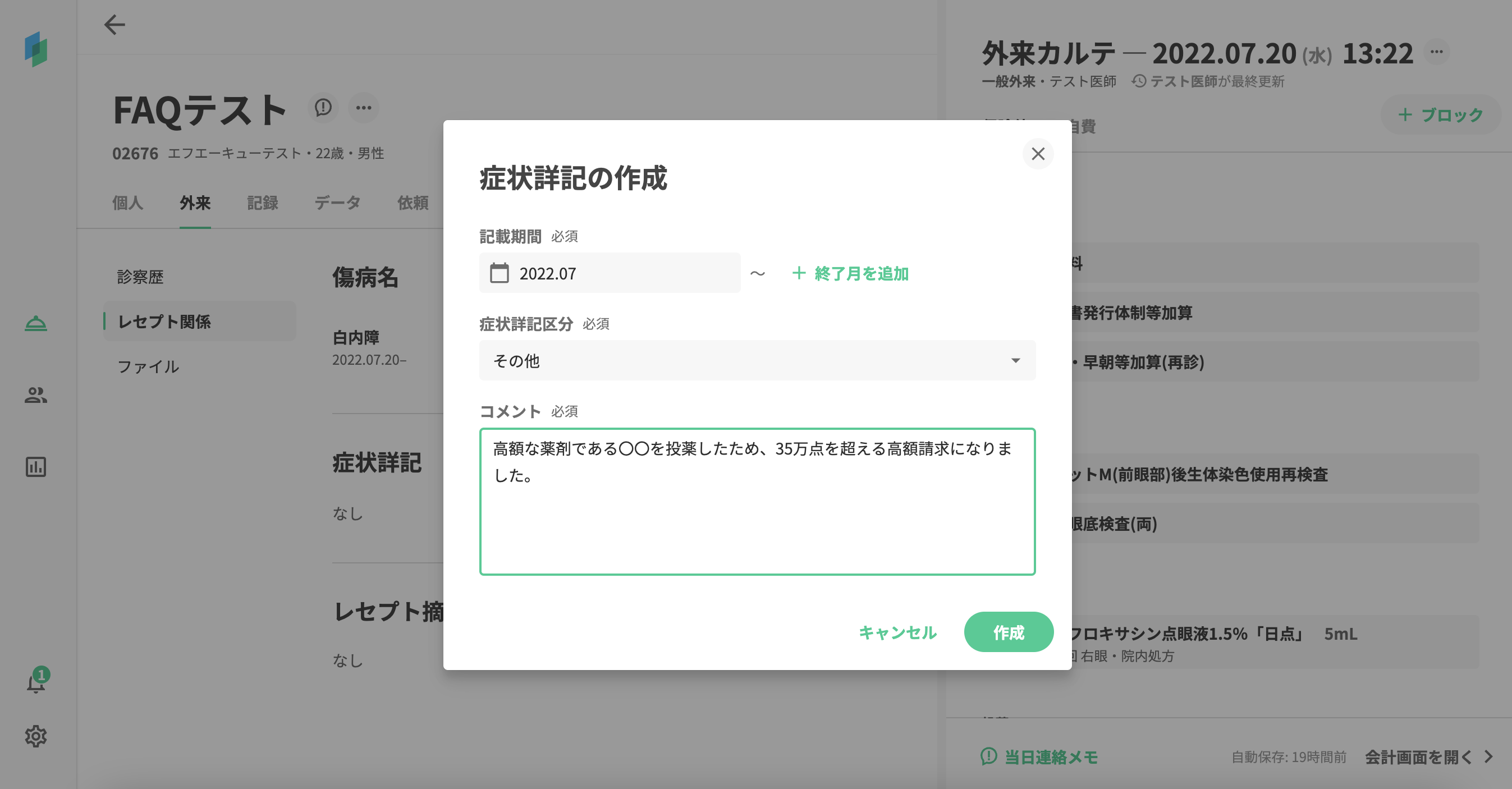ここでは、会計画面を例に症状詳記の追加・編集方法説明します。