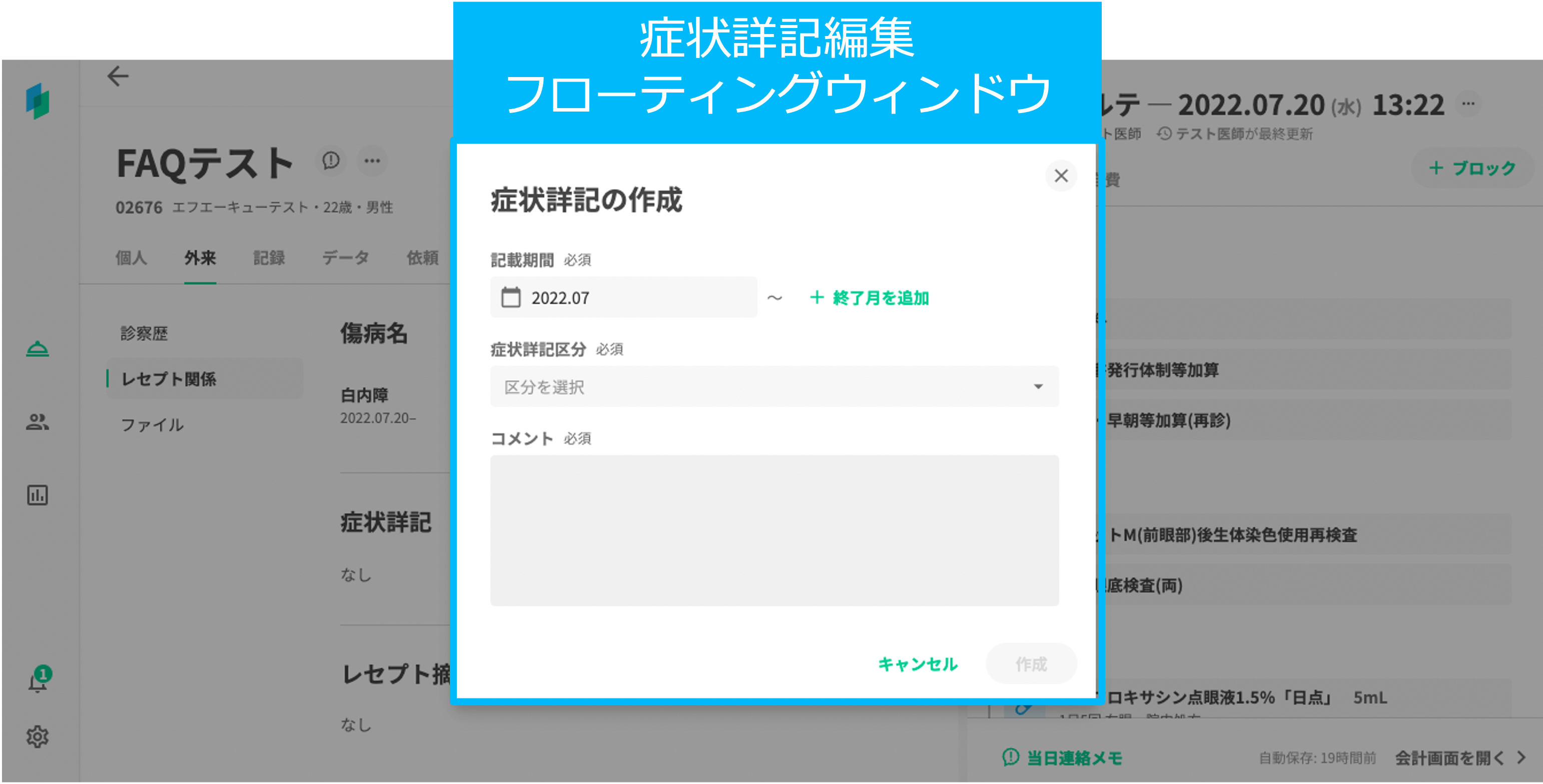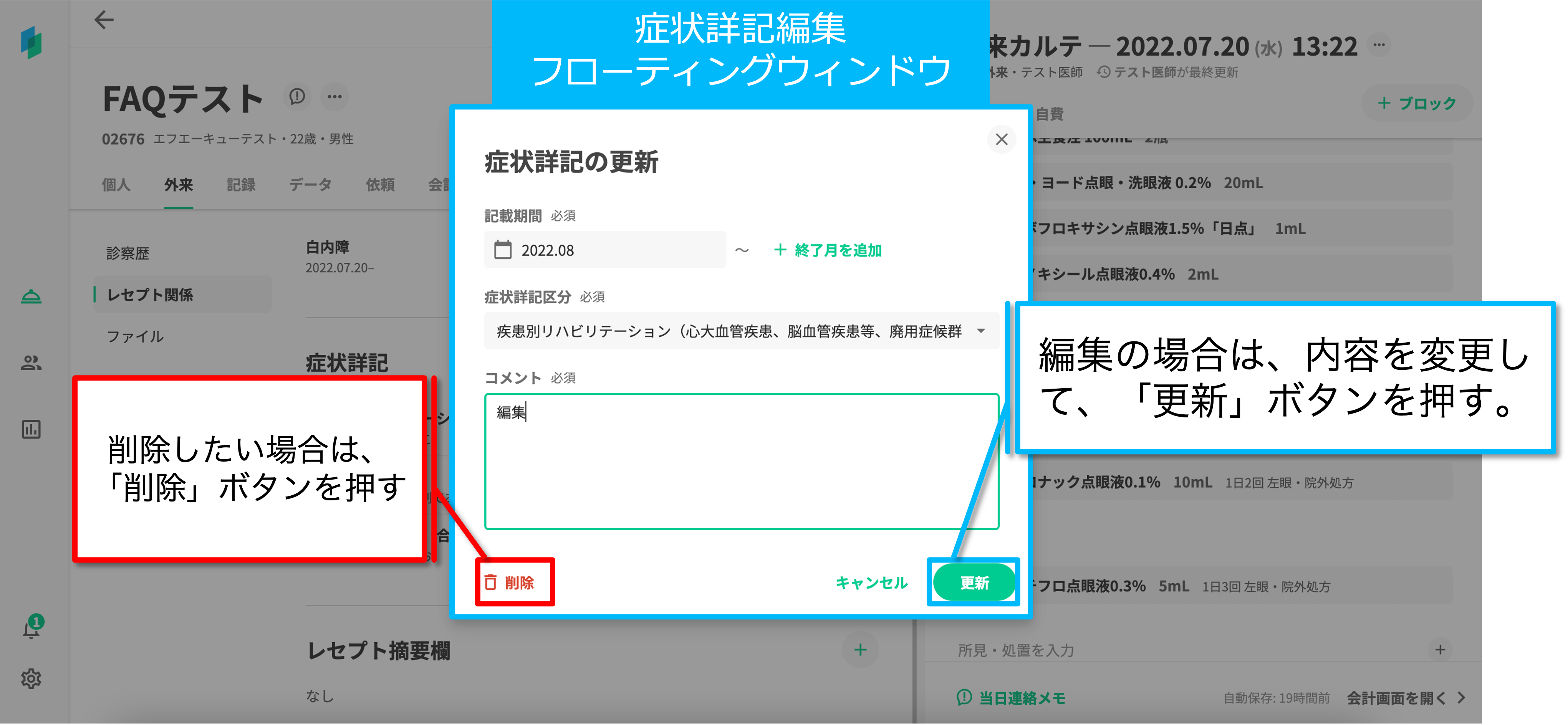 登録した症状詳記を編集したり記載期間を変更する場合は、表示されている症状詳記をクリックして表示される編集フローティングウィンドウで内容を変更して「更新」ボタンを押下することでおこなえます。