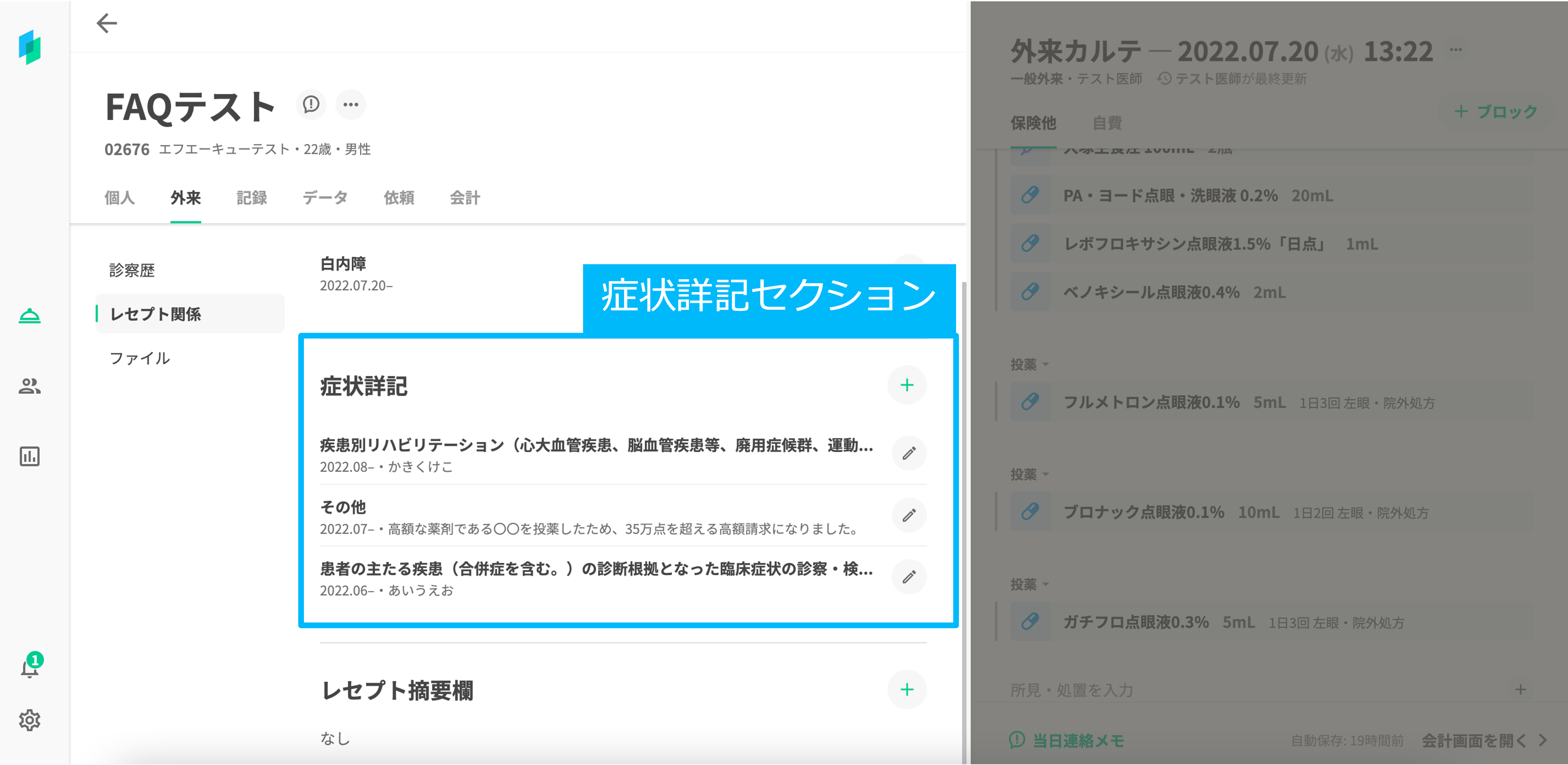 患者に登録されている症状詳記は、症状詳記セクションで確認できます。 症状詳記は、記載期間の開始年月が新しい順に表示されます。