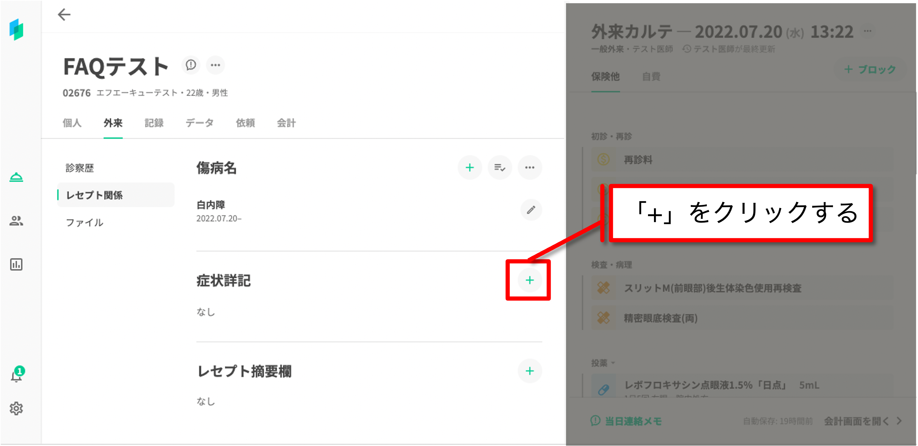 2. 症状詳記セクションの「+」を押下し、症状詳記編集フローティングウィンドウを開きます。