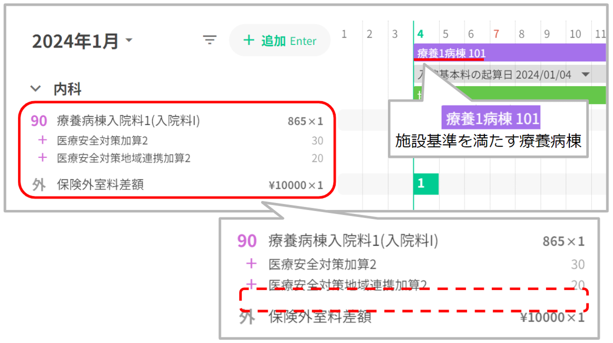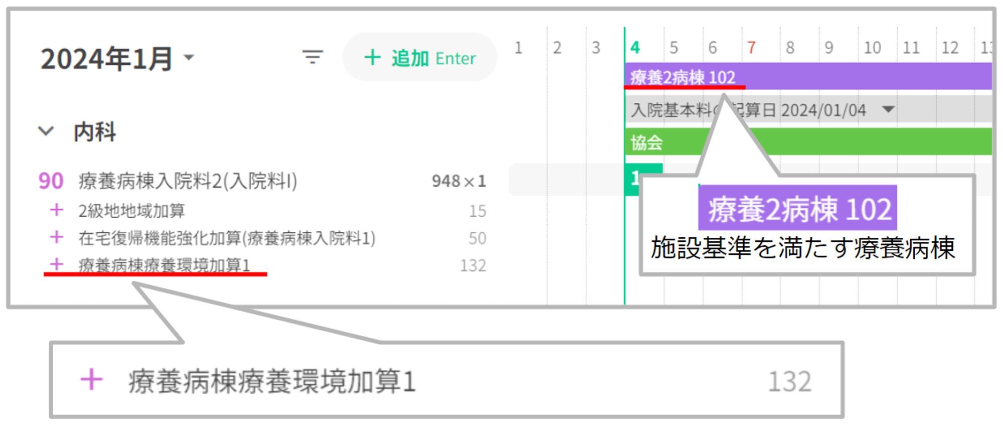 💡 療養病棟療養環境加算の自動算定には設定が必要です。 詳細につきましては、担当者までお問い合わせください。