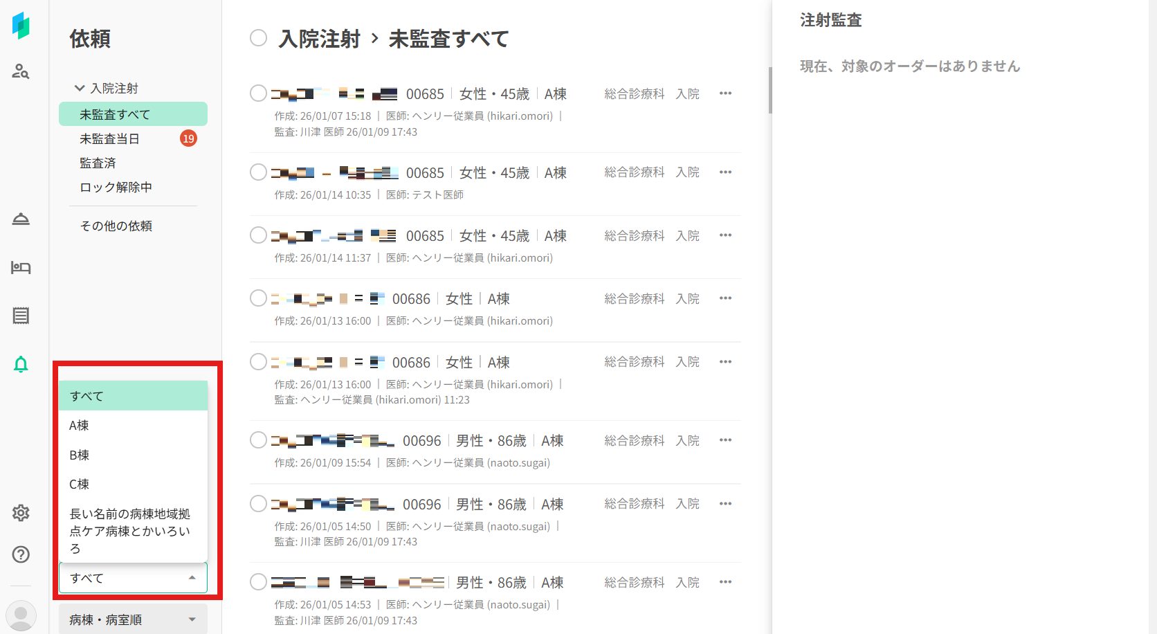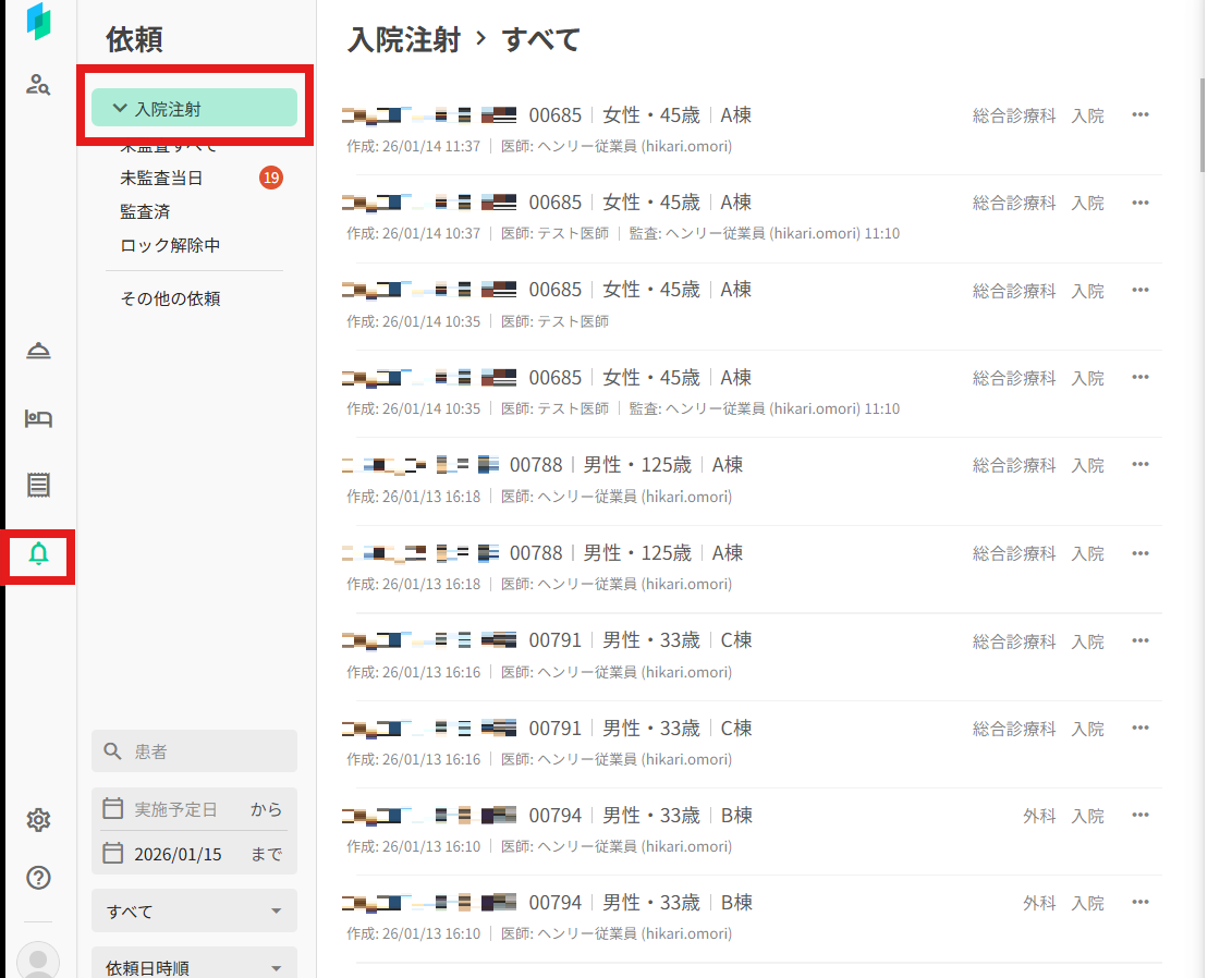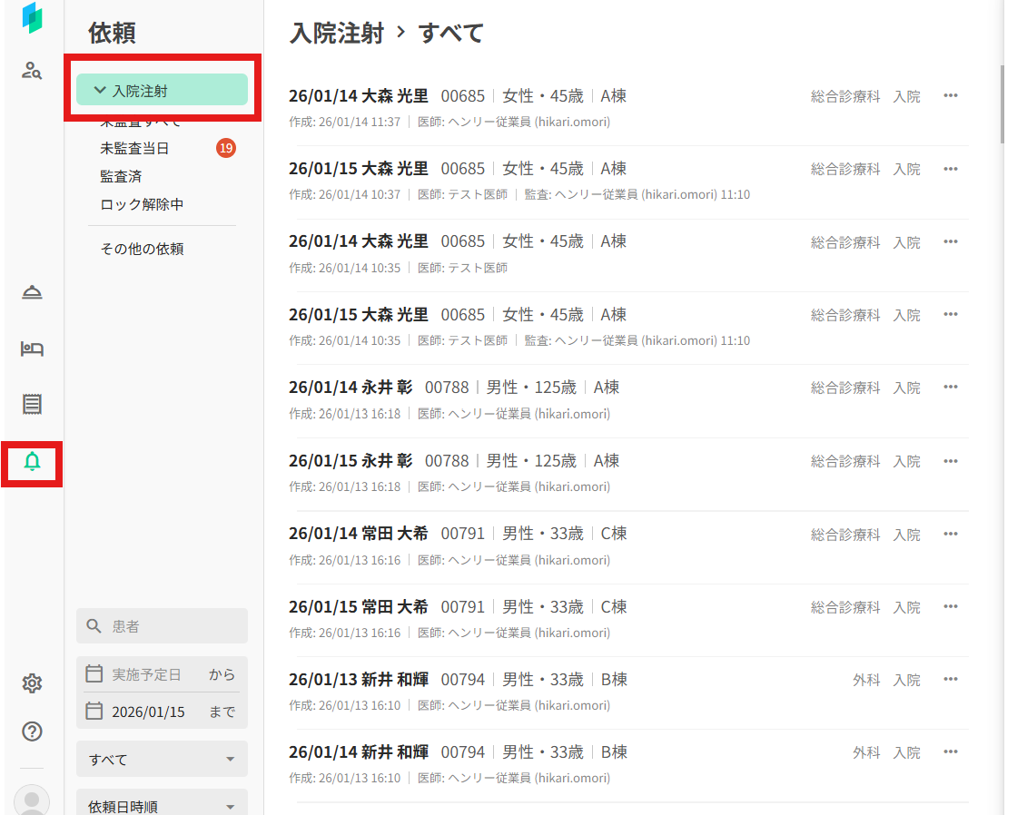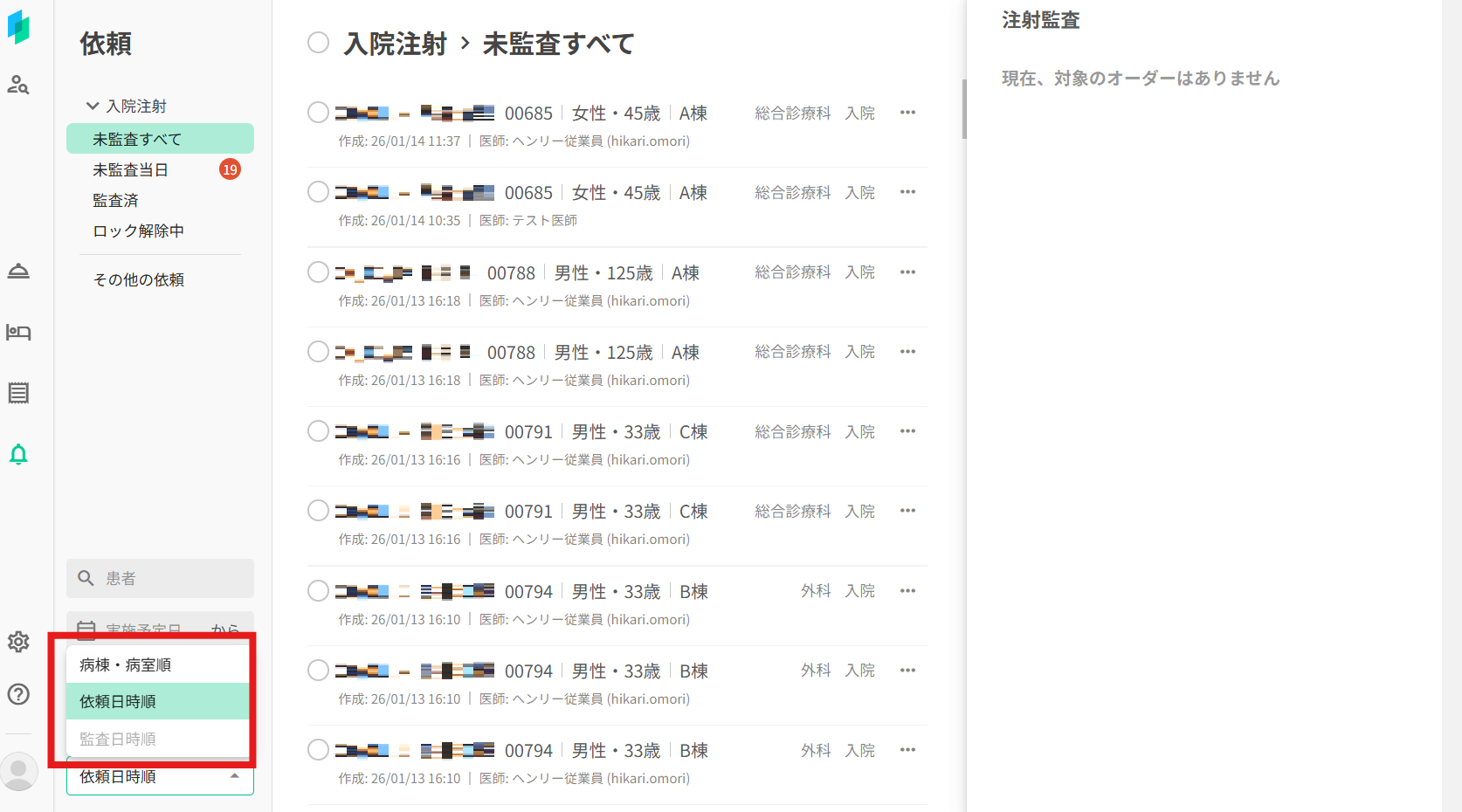 監査権限を持つユーザーが 依頼とタスクより「入院注射」を選択した場合のみ、監査管理画面が表示される挙動になります。