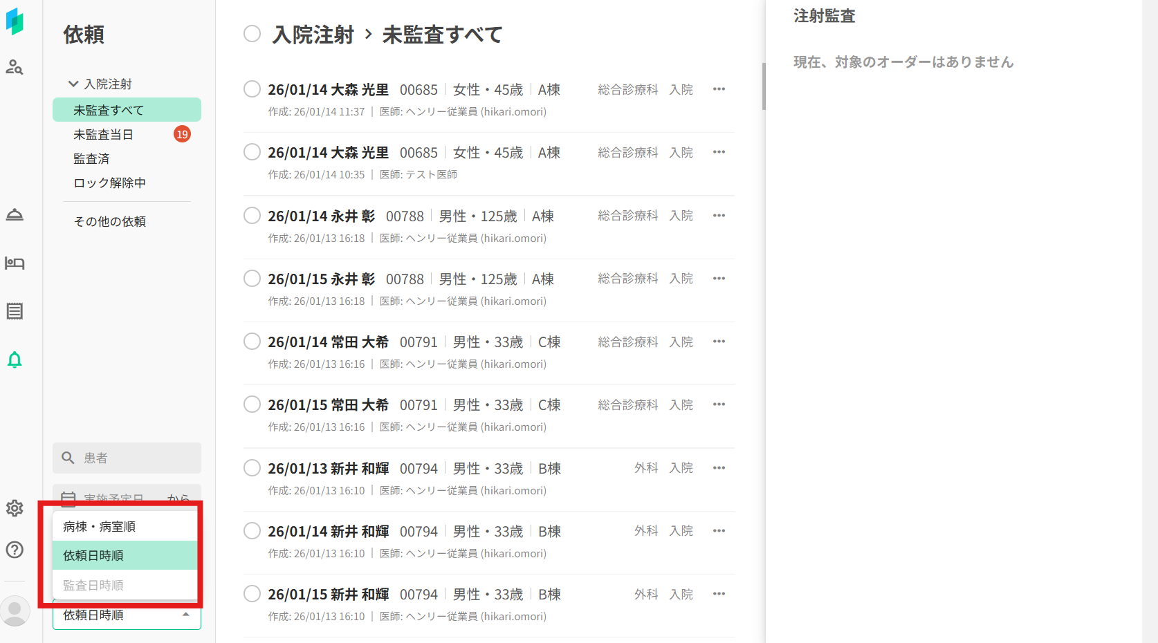 監査日時 降順 → 患者番号 昇順 → 実施予定日 昇順 → オーダー開始日昇順→オーダー作成日時 昇順