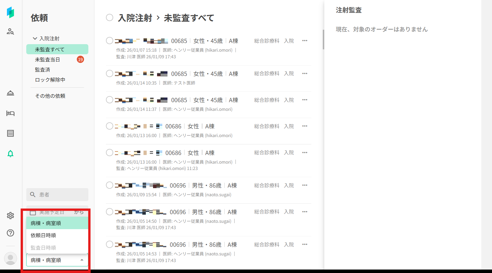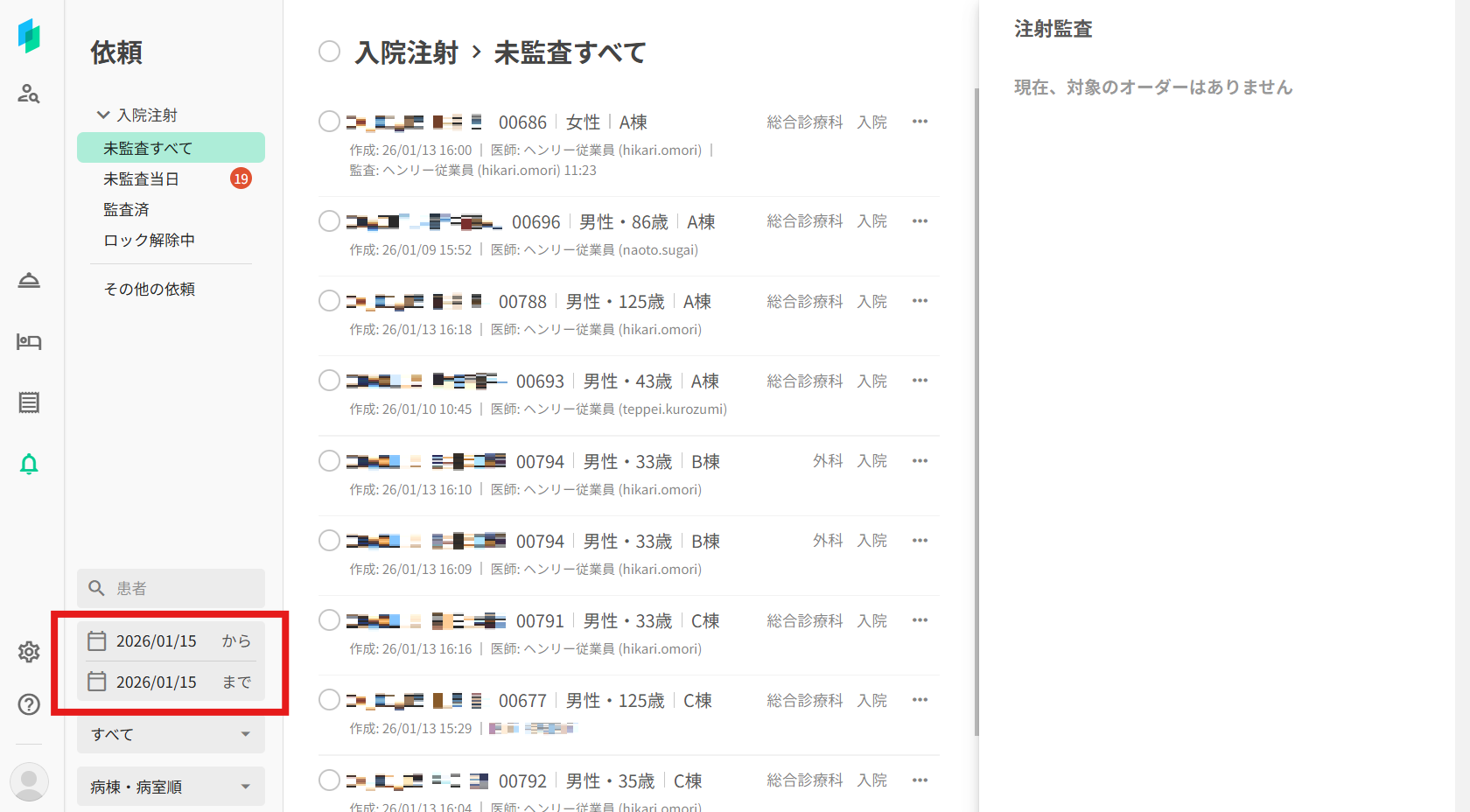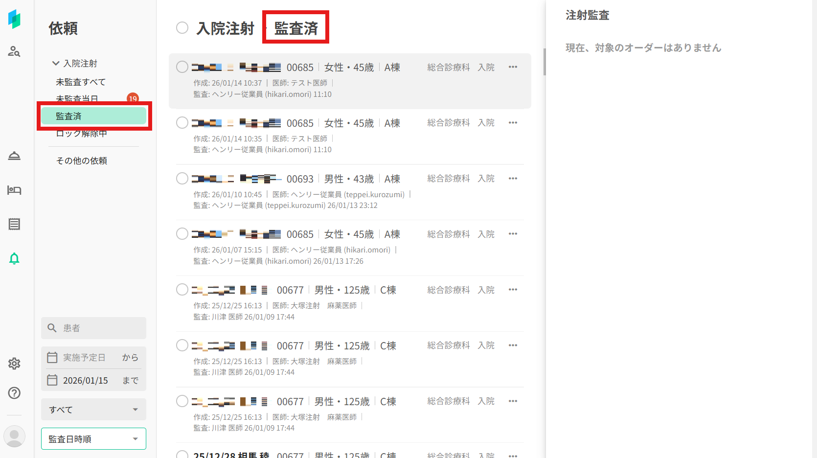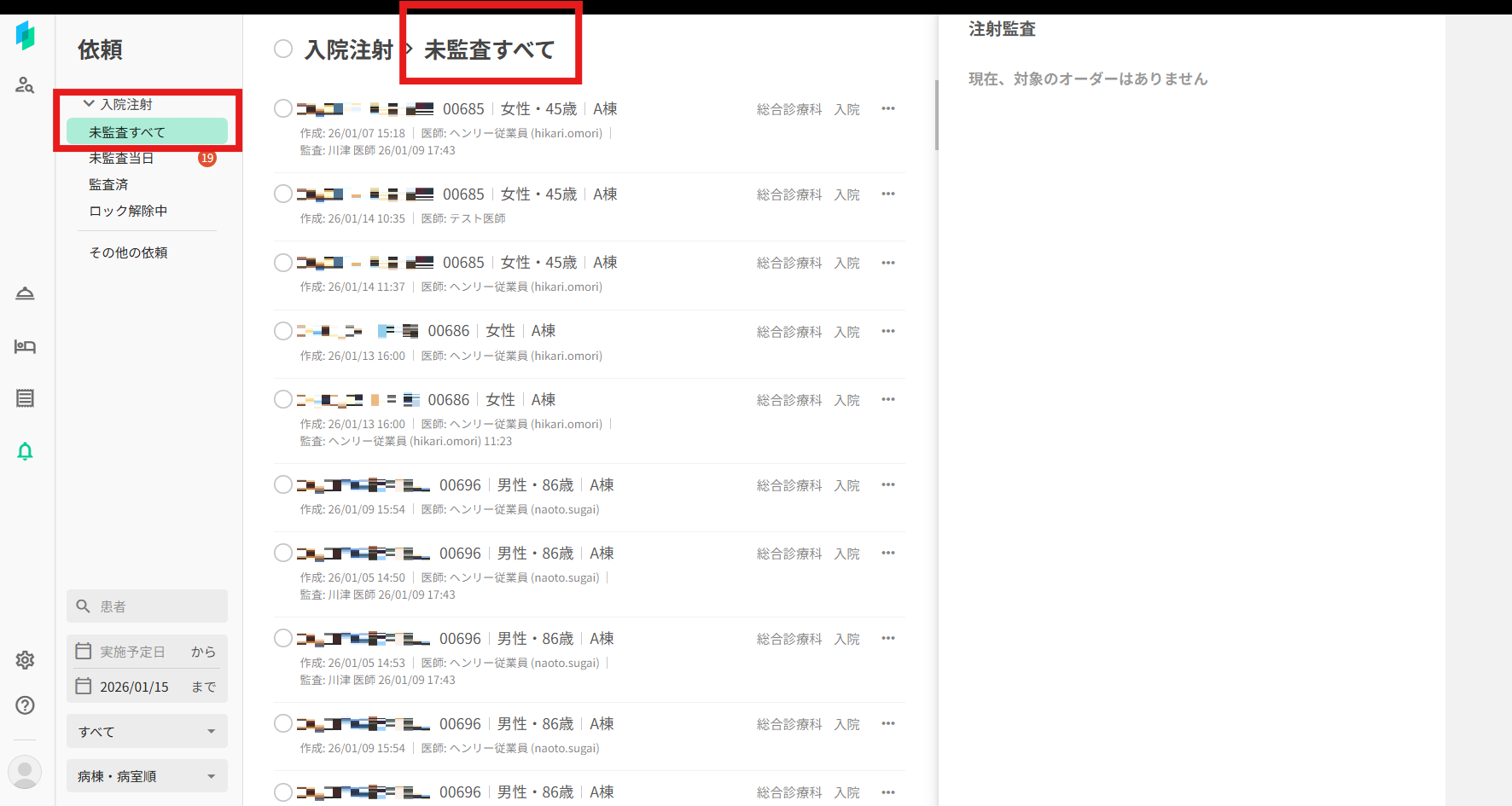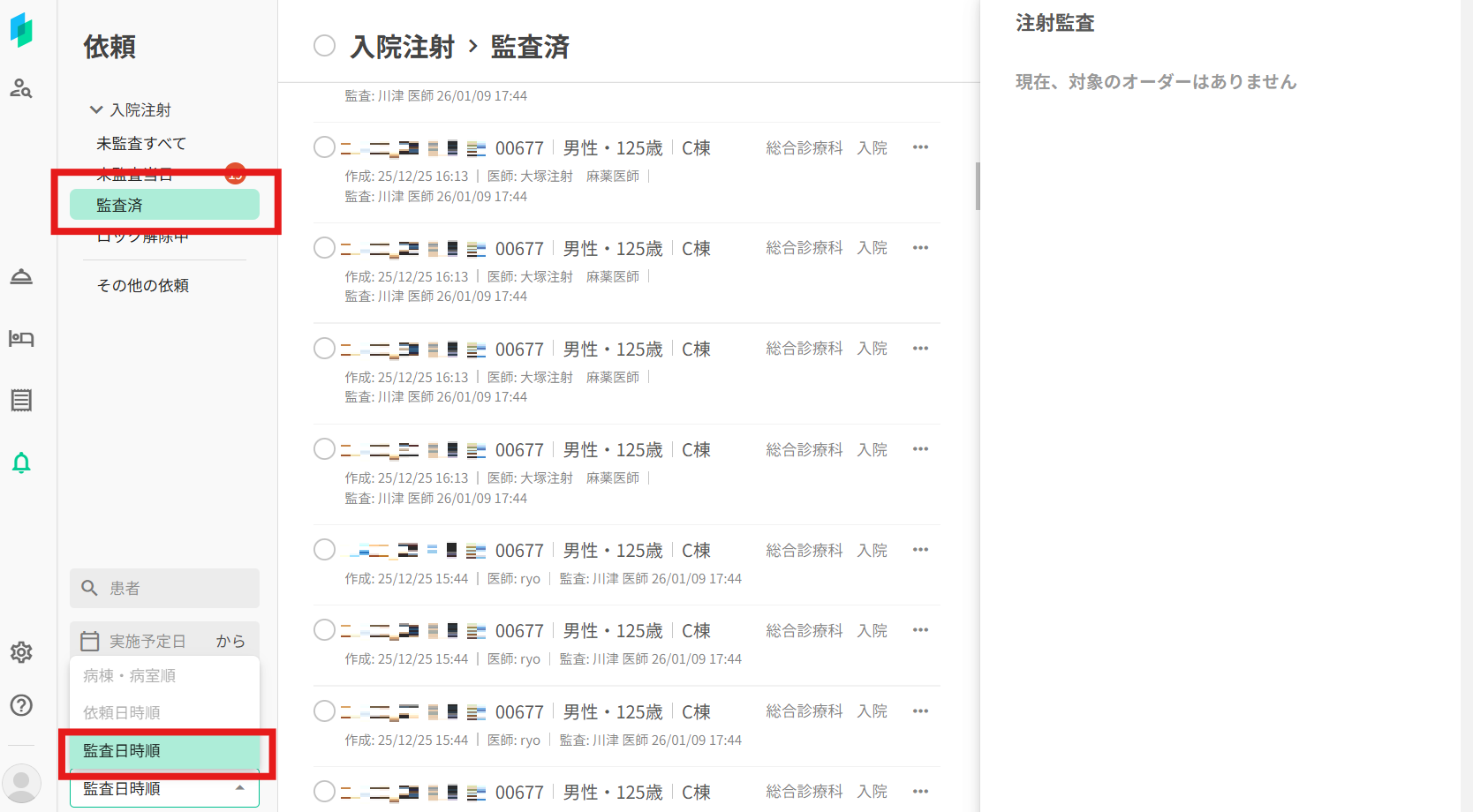 監査一覧画面に未監査の注射オーダー一覧が表示されます