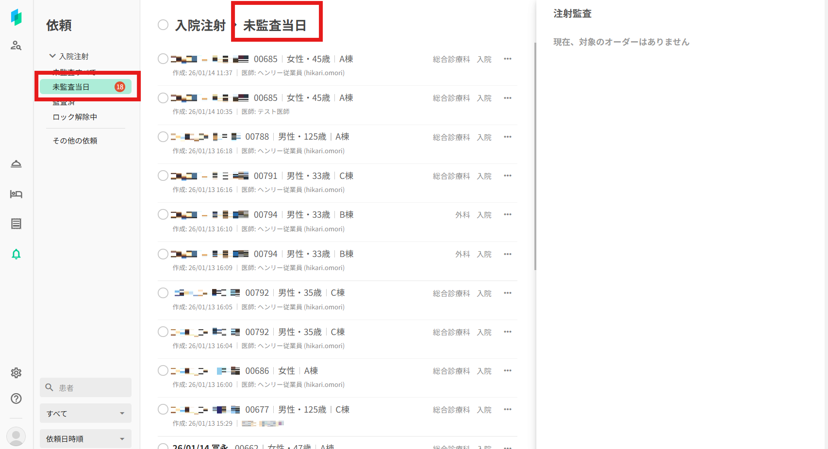 監査一覧画面に当日の未監査注射オーダー一覧が表示されます