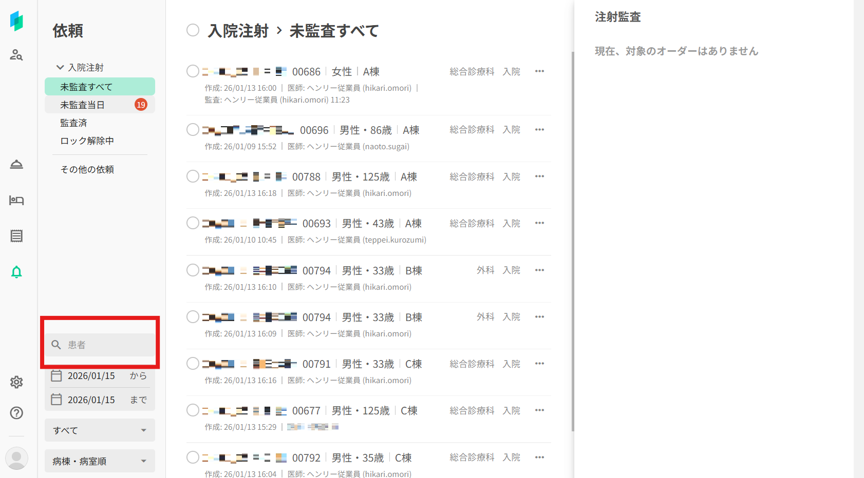 画面左のサイドバーから、確認対象の患者名またはIDを入力します