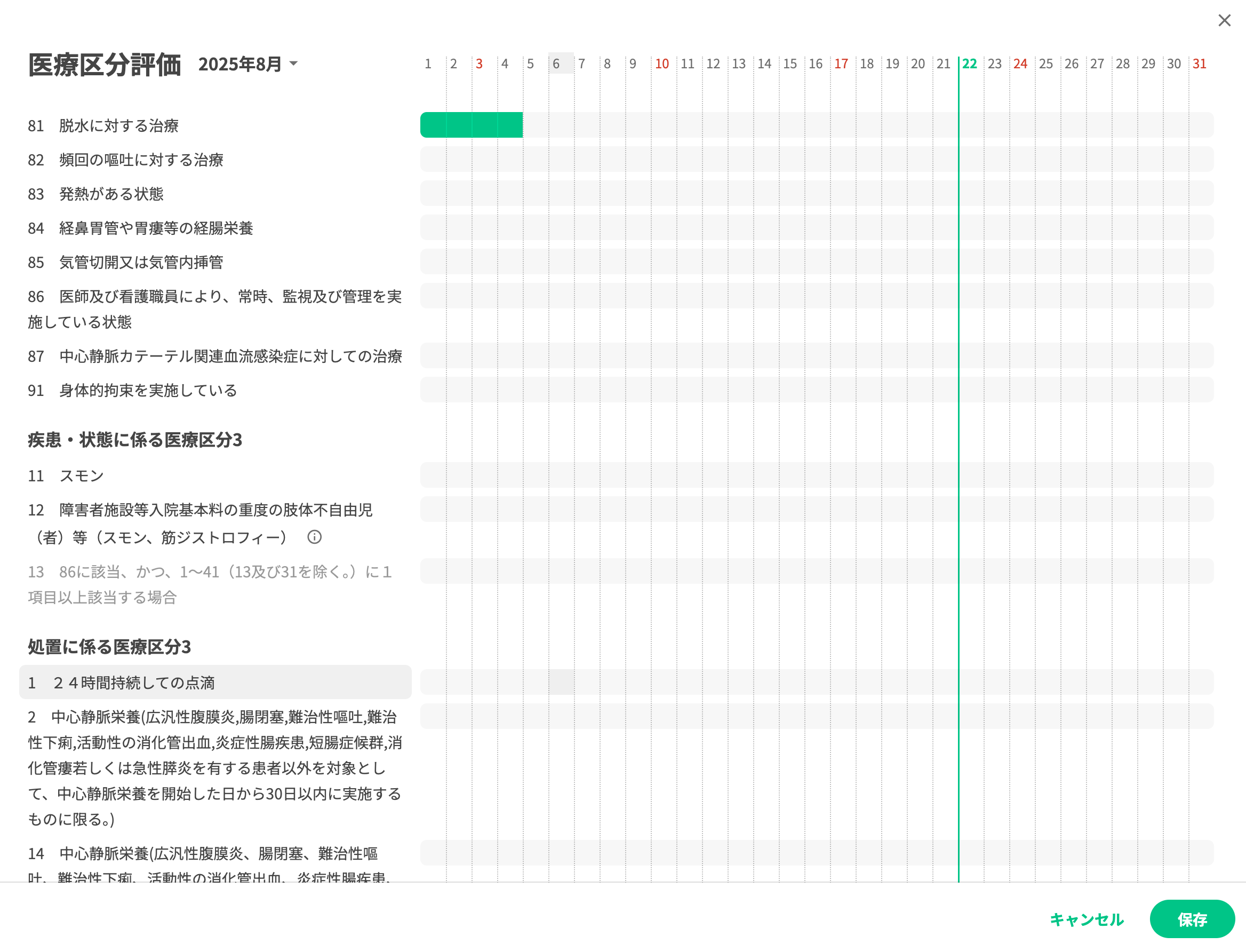 医療区分評価の入力画面では「疾患・状態に係る医療区分評価」「処置等に係る医療区分評価」を確認できませんでした。