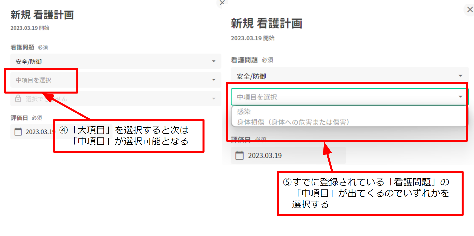 4.「大項目」を選択すると次は「中項目」が選択可能となる 5. すでに登録されている「看護問題」の「中項目」が出てくるのでいずれかを選択する