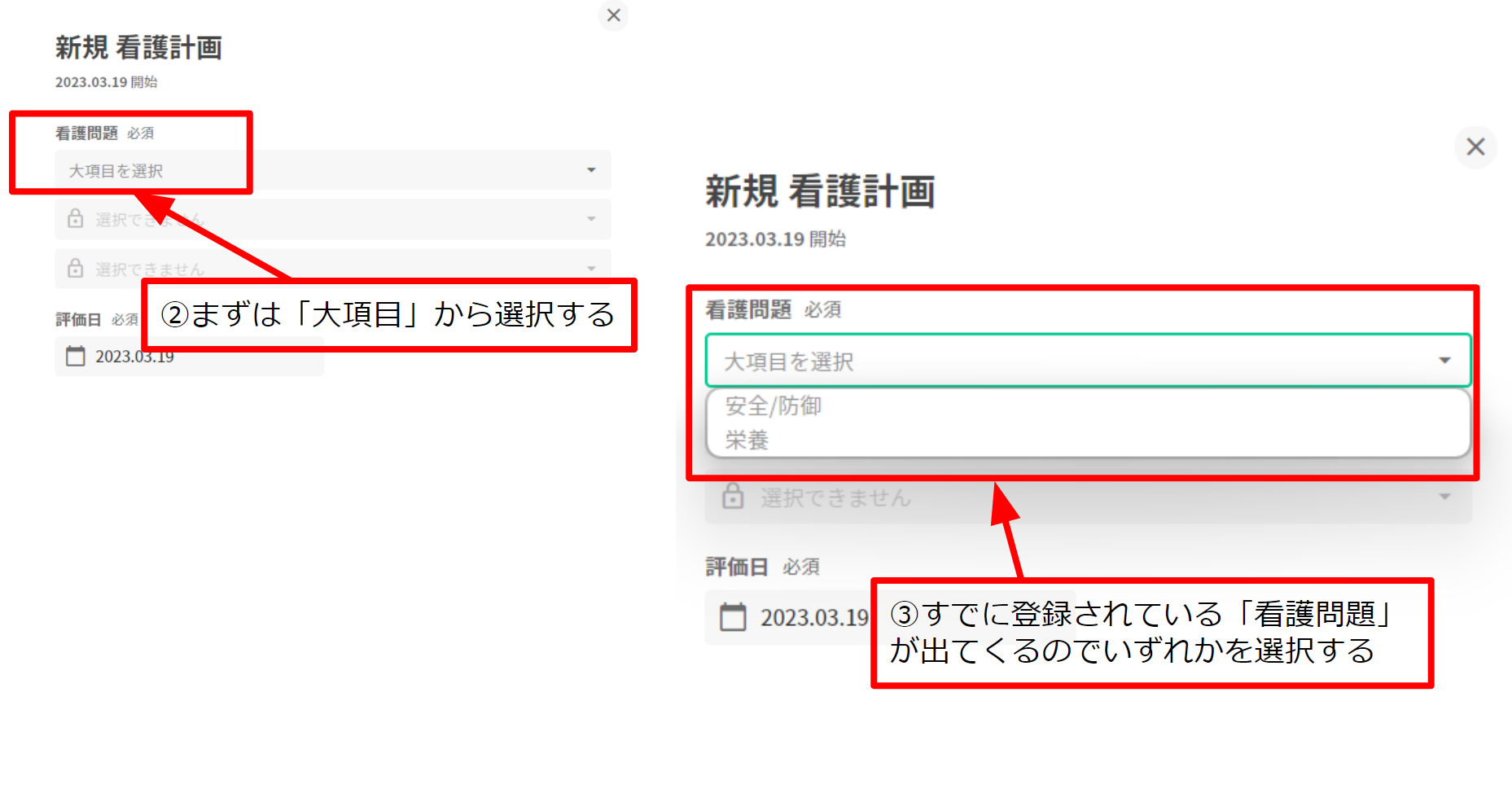 2.まずは「大項目」から選択する 3. すでに登録されている「看護問題」が出てくるのでいずれかを選択する