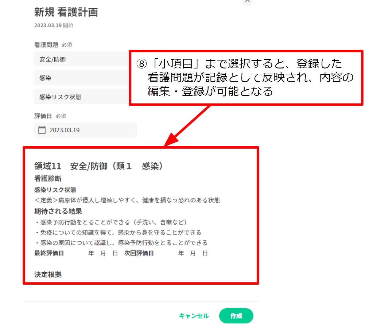 8.「小項目」まで選択すると、登録した看護問題が記録として反映され、内容の編集・登録が可能となる