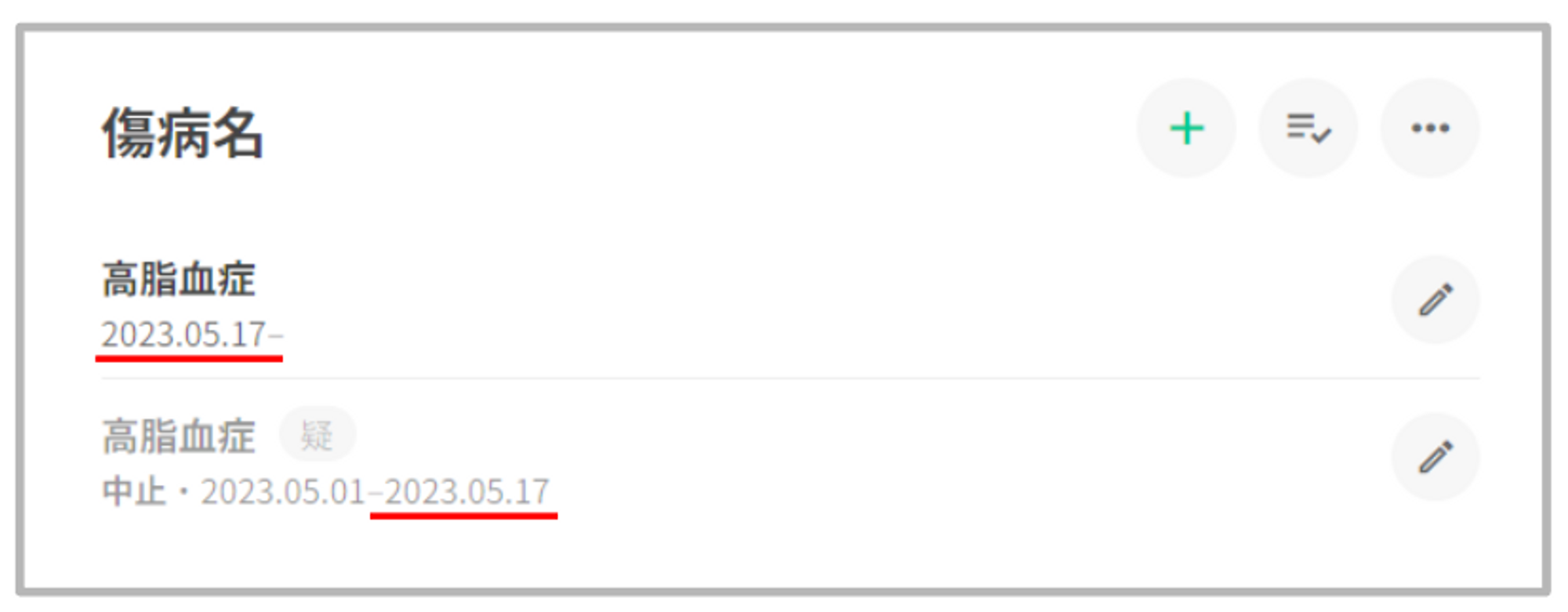 疑い傷病名の終了日は手動での設定をお願いいたします。疑い傷病名の終了日は自動で設定されませんのでご留意ください。