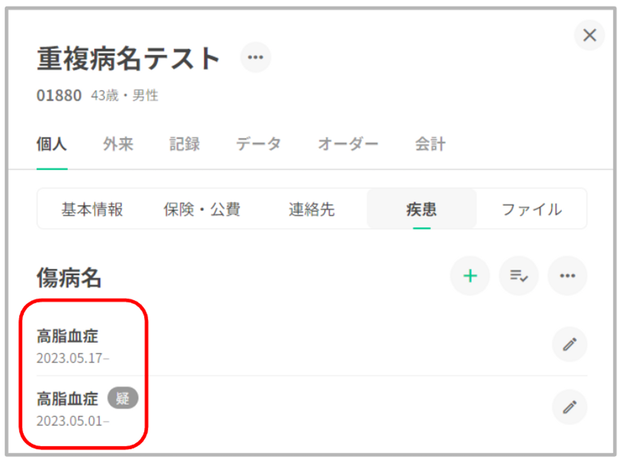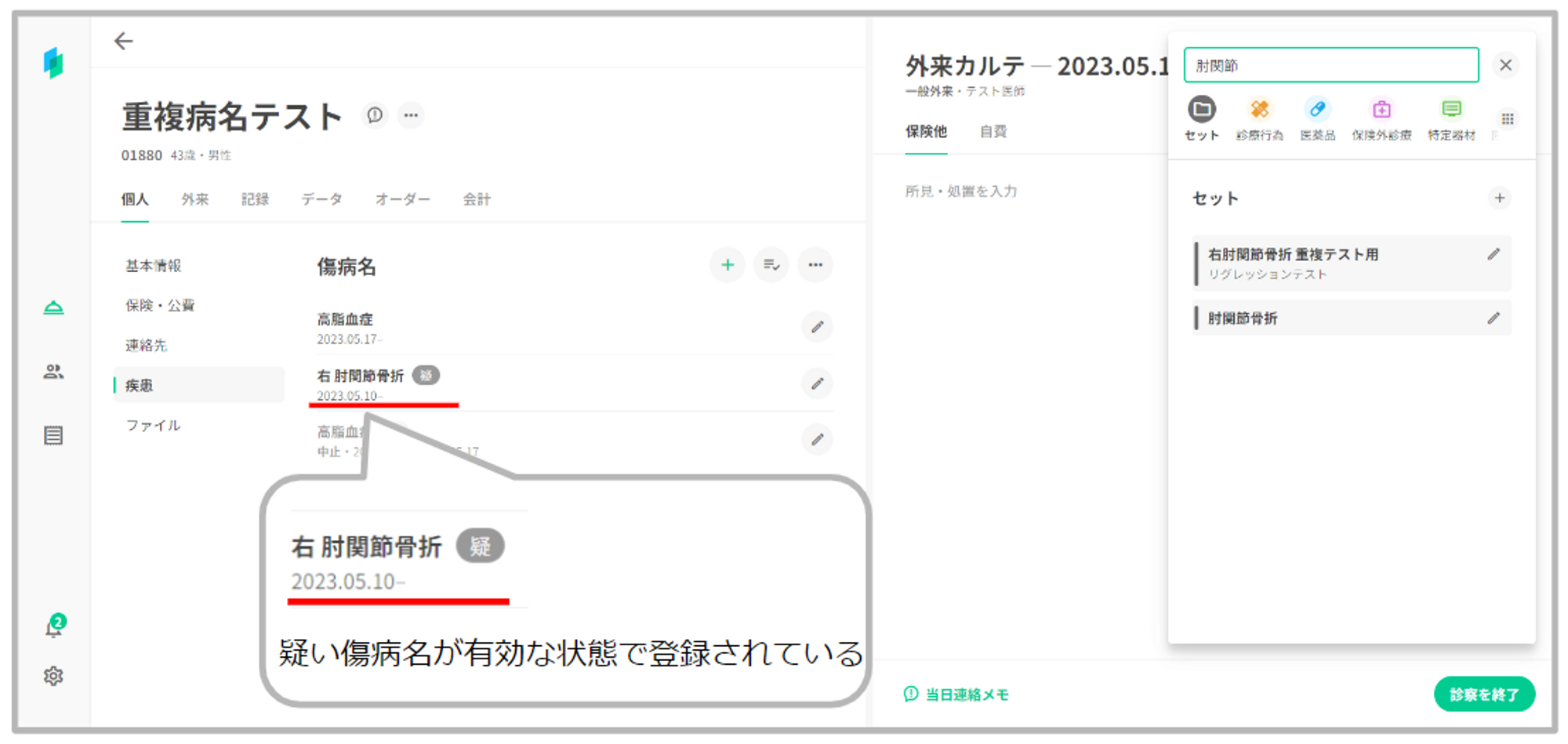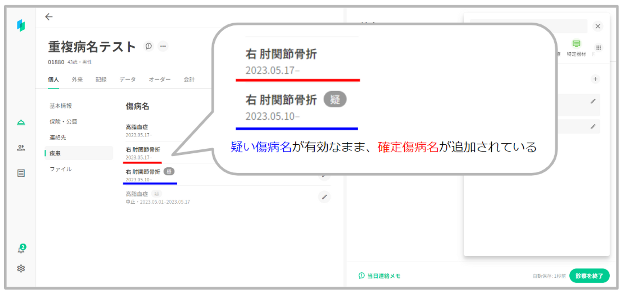 既存の疑い傷病名が有効な状態のまま、セットより確定傷病名を追加することが可能です。