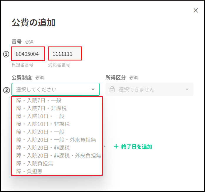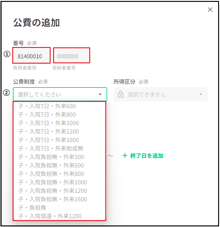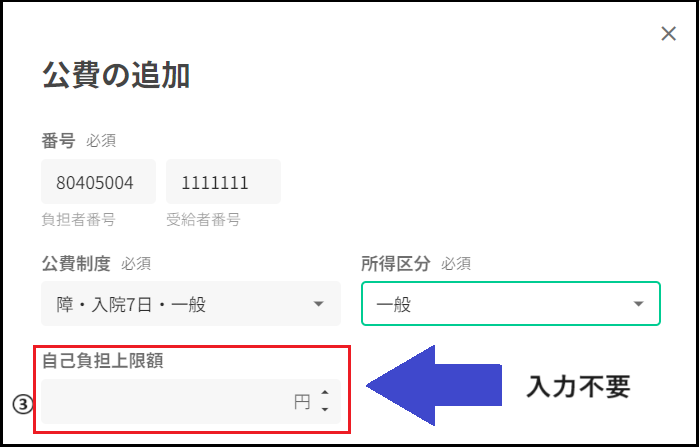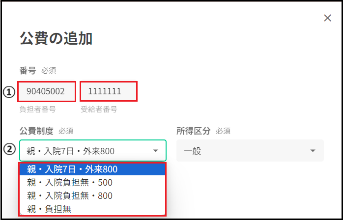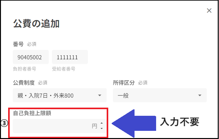 ①負担者番号・受給者番号を入力下さい。 ②負担者番号・受給者番号を入力すると、該当する公費制度が選択できるようになります。 所得区分は、公費制度を選択すると自動で反映されます。 公費制度は、医療証の一部自己負担金の金額を参照に入力します。 ③自己負担上限額は入力不要です。