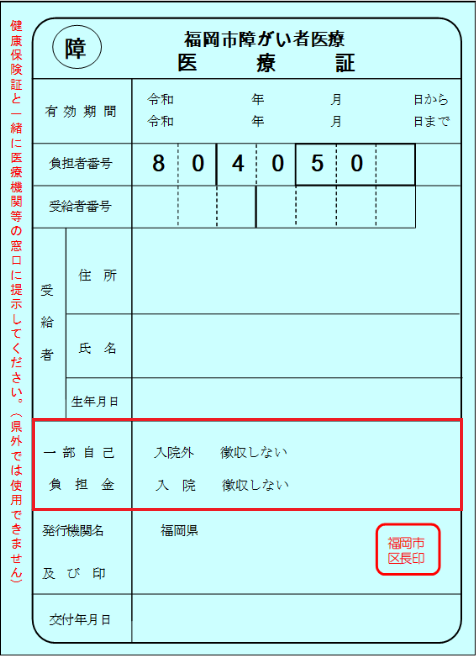 重度障がい者の方が、健康保険証を使用して福岡県内の医療機関等を受診された場合に、窓口で支払われる医療費(健康保険の自己負担額)の一部又は全額を福岡県の市町村が助成する制度