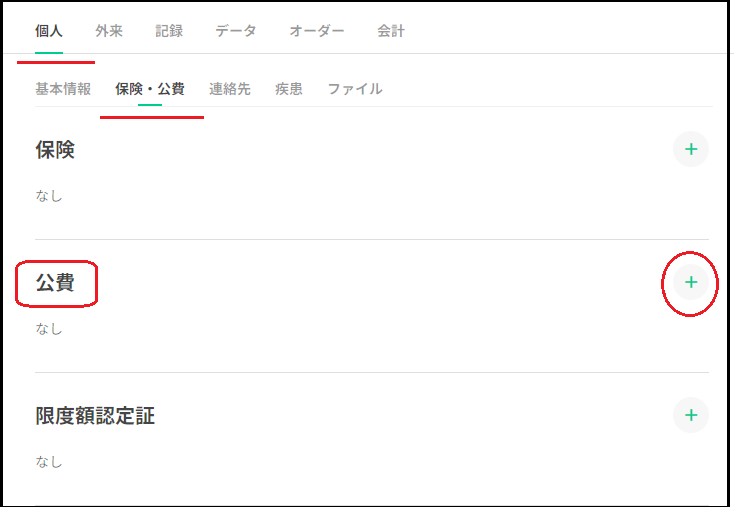 個人タブの保険・公費から公費欄の「+」を押下します。