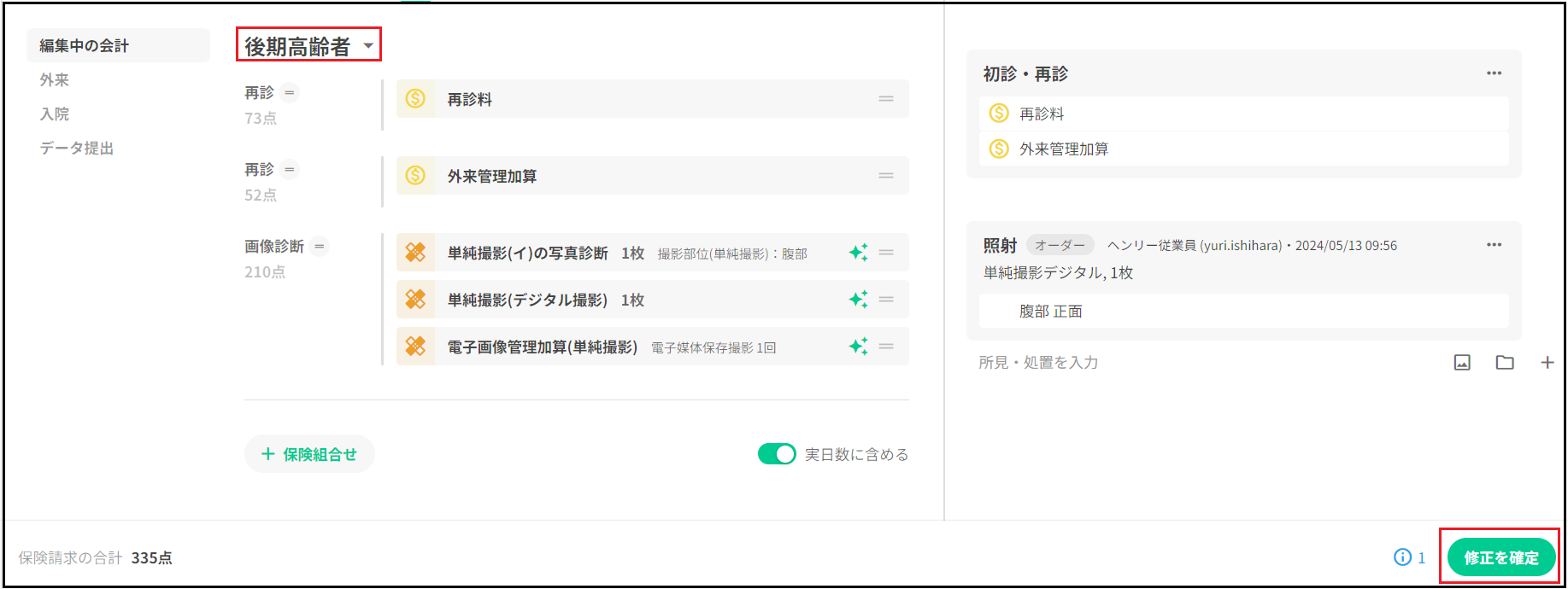 「後期高齢者+障・入院7日・一般」の右隣りの「▼」を押下します。 保険・保険+公費・自費が選択出来るので、「後期高齢者」を選択し、右下の「修正を確定」を押下します。