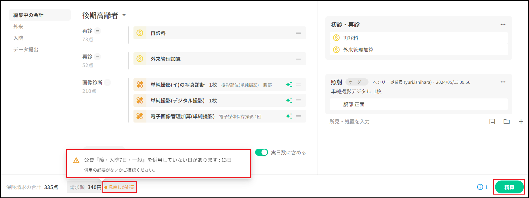 公費を使用の方で、外来の会計が上限額に満たない場合は保険単独での請求となります。 会計の組み合わせが国保+公費となっているので、手動で保険単独請求への変更が必要になります。 【例】後期高齢者+障・入院7日・一般の場合