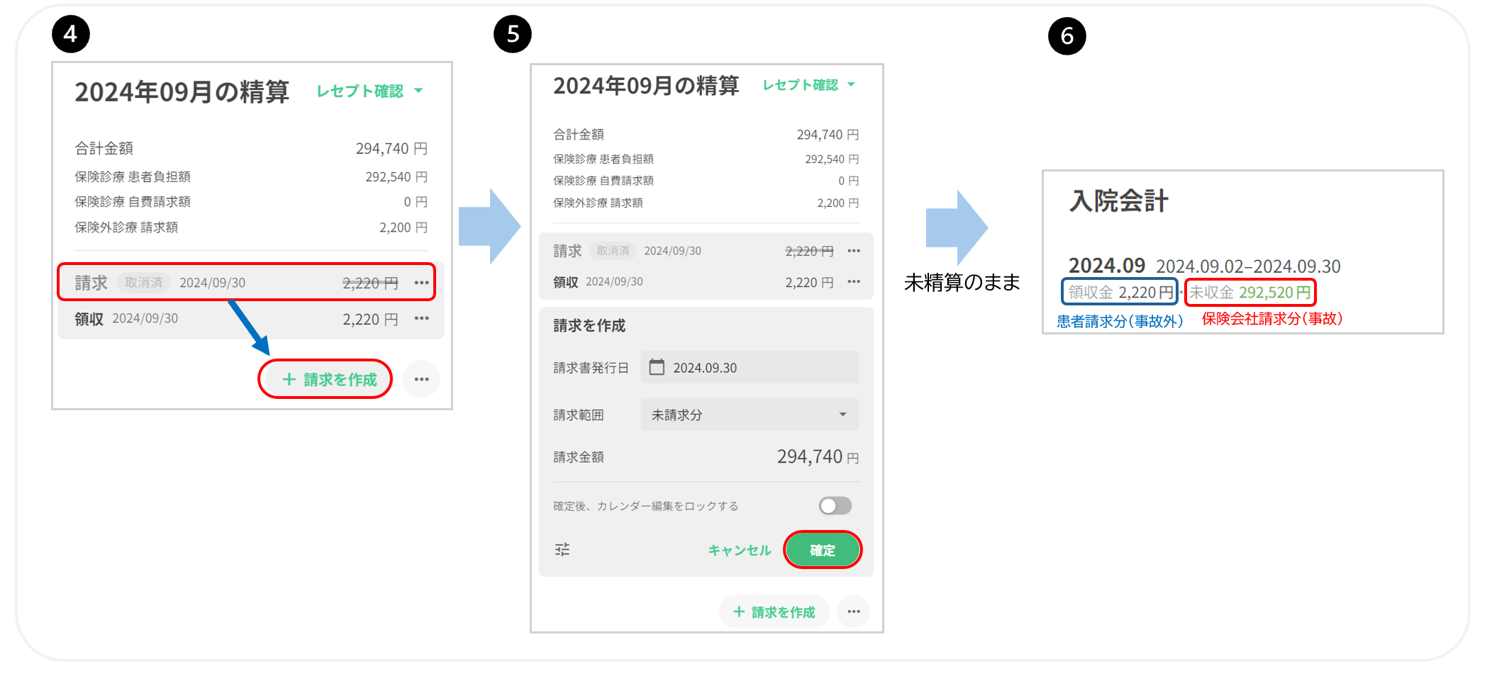 取消済みになったら+請求書を作成を押下し、新しい請求を作成します確定を押します(負担額は未精算のままにしておきます)入院会計は下記の状態になります