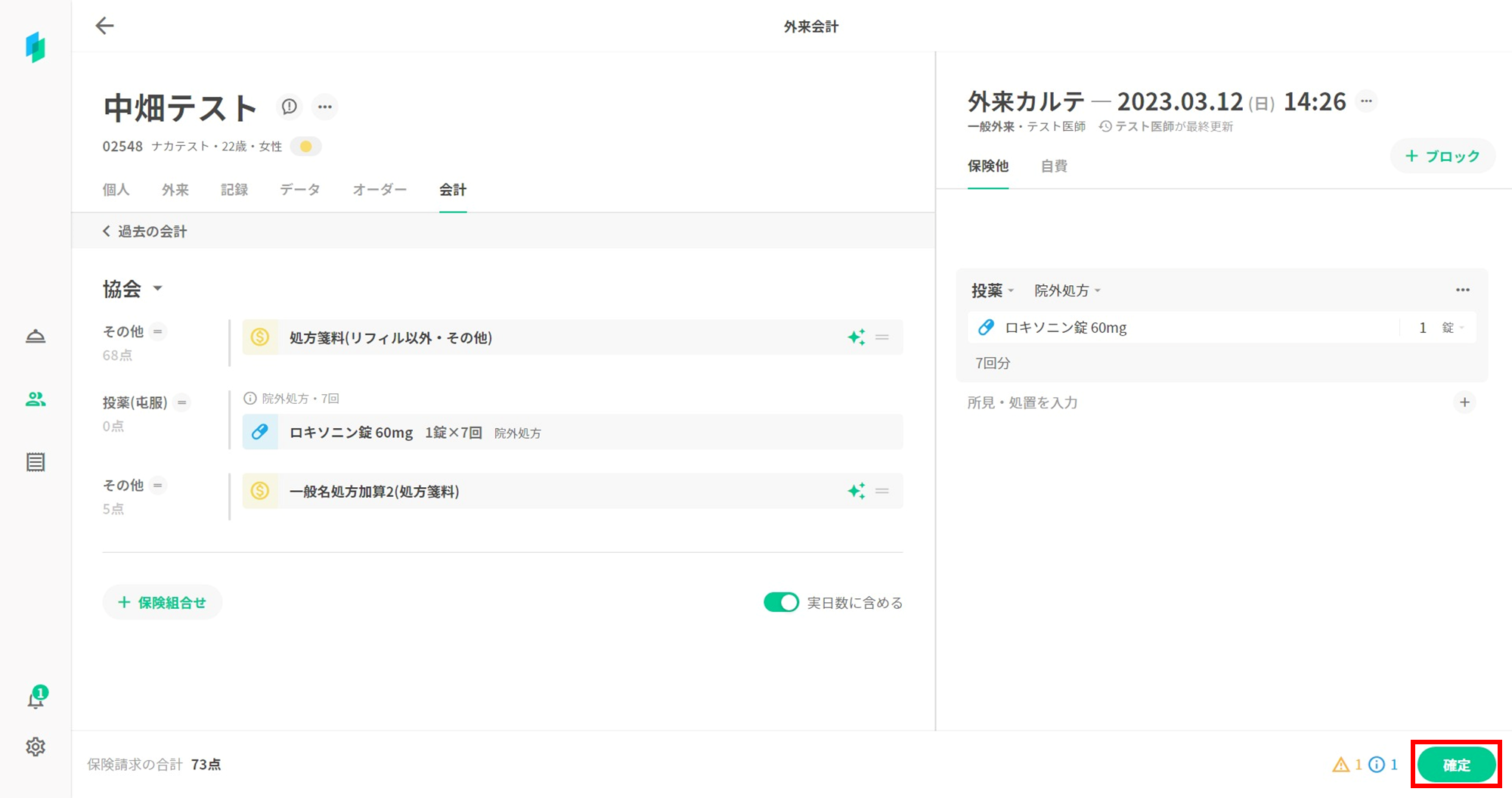 1.会計画面右下の「確定」をクリックし、精算画面を開きます。