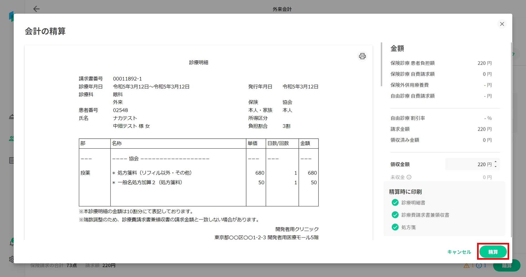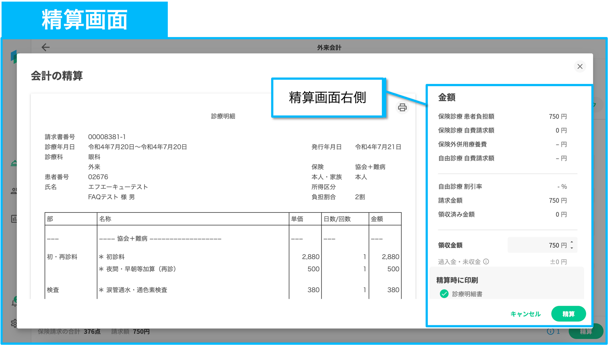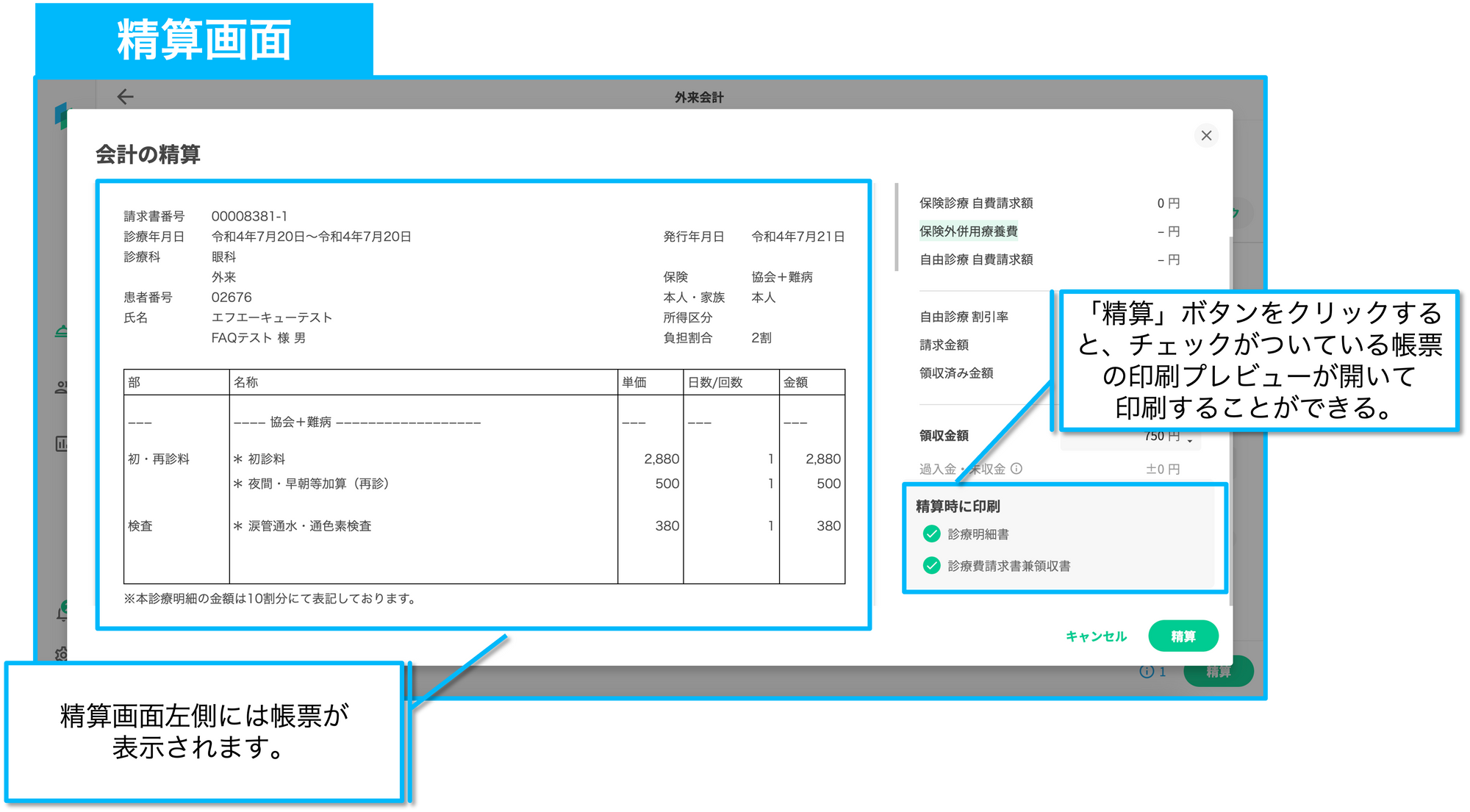 また、画面右下に精算時に印刷する帳票が表示されます。印刷するものにはチェックを入れる必要があります。(初期値は全てチェックあり)