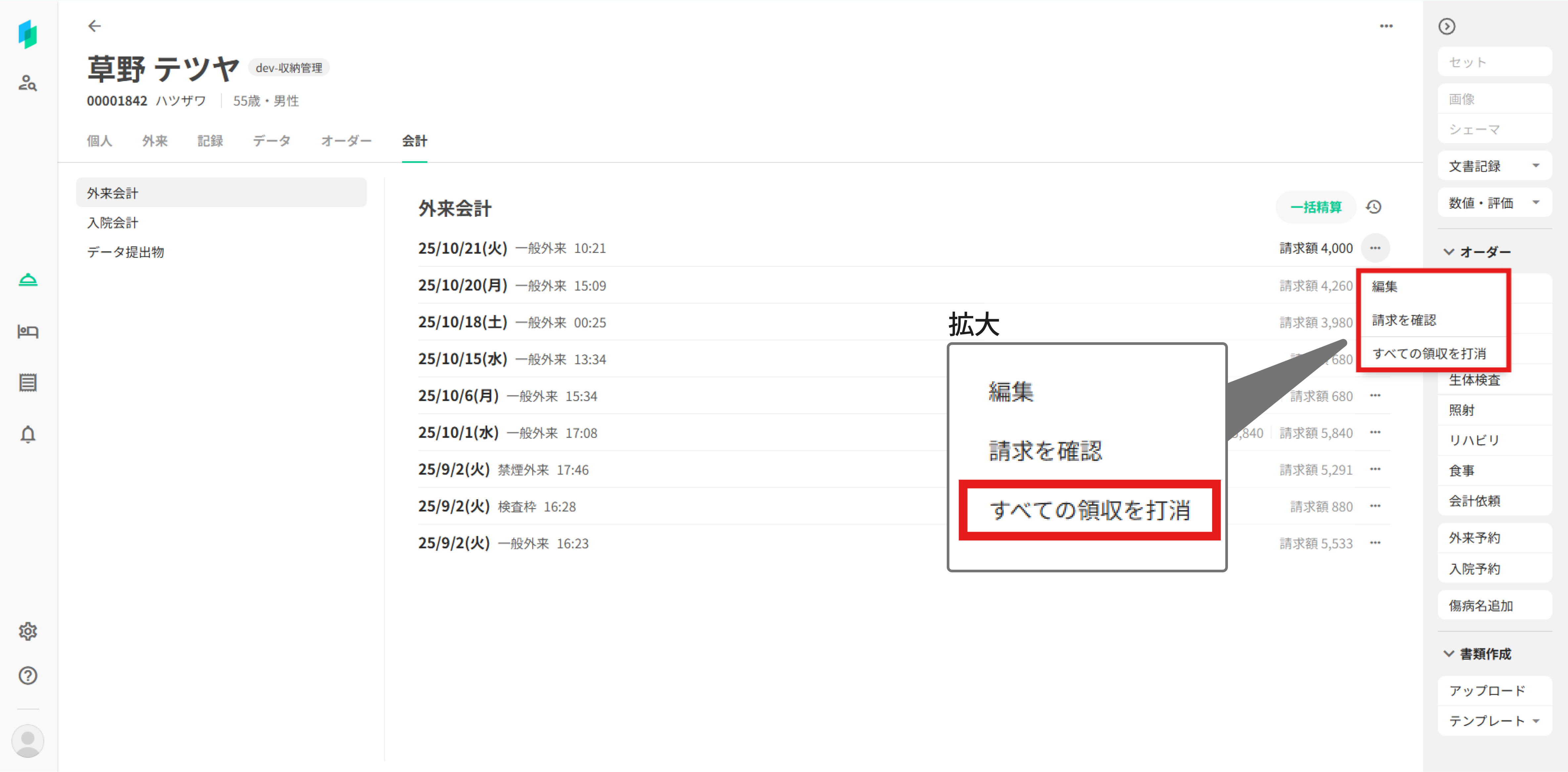 ※会計一覧から会計画面を開き、右下の請求を確認ボタンを押下→請求ウィンドウの ⋯ ボタンから「すべての領収を打消」を選択でも操作可能です。