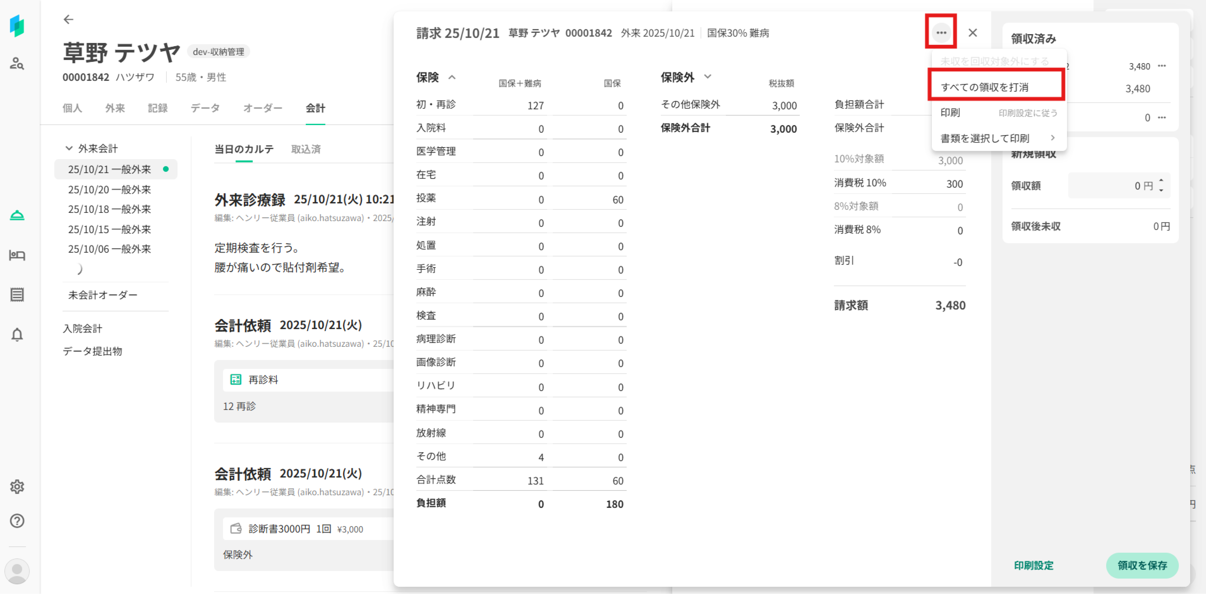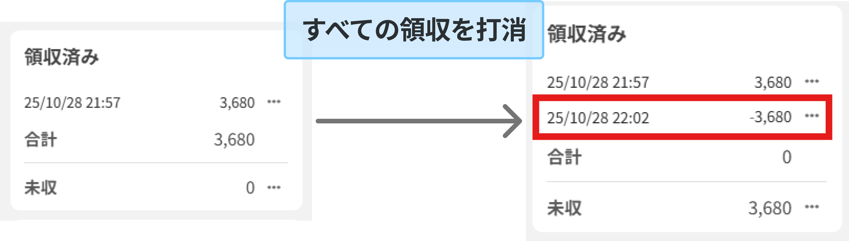会計一覧で各会計の ⋯ ボタンから「すべての領収を打消」を選択します。