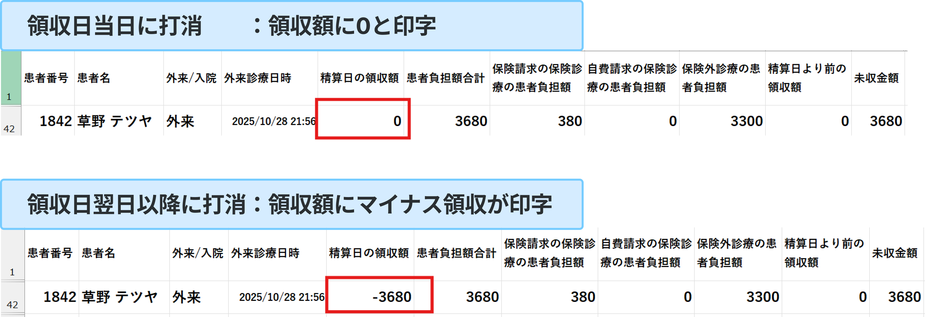 領収日翌日以降に打消処理をした場合:精算日の領収額にマイナス領収が表示されます。